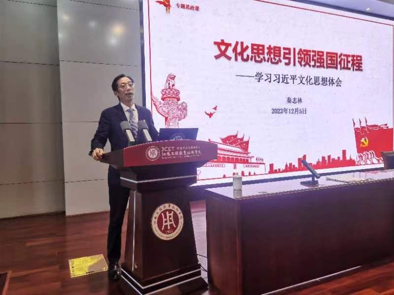 秦志林指出,文化是根植于人内心的修养,更是一个国家、一个民族的灵魂。中华民族创造了悠久灿烂的文明,中华优秀传统文化、社会主义先进文化在新时代融会贯通、生机勃勃。他强调,习近平文化思想是坚守魂脉、守正创新的重要理论,是赓续根脉、茹古涵今的重要理论,是指导实践、引领变革的重要理论,更是胸怀天下、造福世界的重要理论。报告中,秦志林还援引了《一个人和一座城:张謇与南通》一书中相关章节内容,激励同学们继承和弘扬张謇先生的爱国情怀、创新精神、诚信品格、社会责任与国际视野,争做张謇精神的时代传承人。