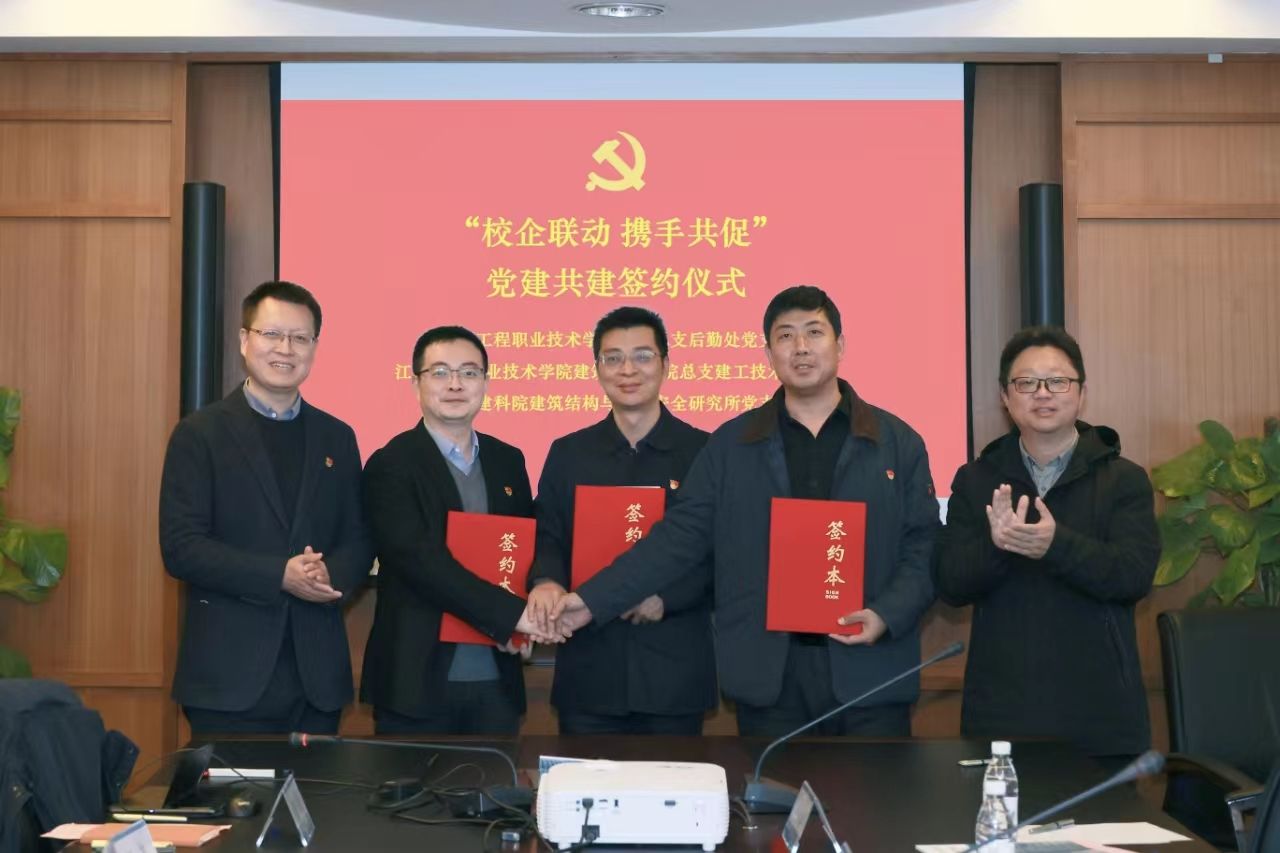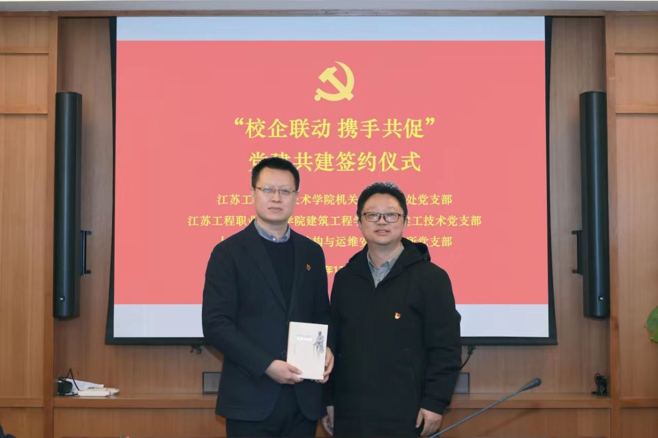 会上,双方举行了签约仪式。在双方领导的共同见证下,我校后勤处党支部书记鲍海忠、建工技术党支部书记袁东进与上海建科院结构所党支部书记李占鸿签订了党建共建协议书,为双方后续在党建、育人、科研等方面的深度交流与合作注入红色基因。同时,孙兵代表学校向杨建荣赠送了学校书籍《一个人和一座城:张謇与南通》,将共建活动气氛推向高潮。