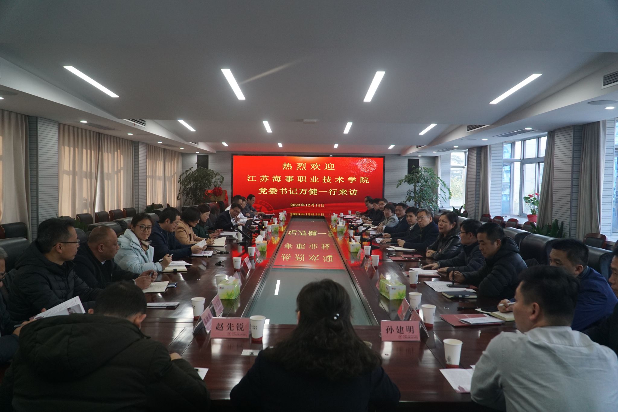 12月14日,江苏海事职业技术学院党委书记万健、校长温华兵一行来校调研交流。校党委书记秦志林,党委副书记、校长陆锦军,党委委员、副校长丛彬彬,党委委员、纪委书记顾剑锋,党委委员、组织部部长仲岑然,党政办、宣传部、发规处、教务处、学工处、科研处、后勤与基建处、安保处等职能部门领导参加了交流活动。