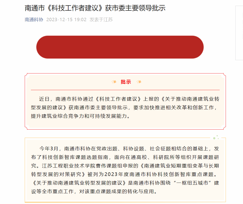 3月,我校曹伟课题组申报的科研课题《南通建筑业短期重组变革与长期转型发展的对策研究(CXZK202302)》被列为2023年度南通市科协科技创新智库重点课题。课题组先后赴通州住建局、南通四建、苏州永联、南通一建、南通智能建造院、现代建筑等省内各地20多家单位调研,最终形成2万字的科研总报告和《关于推动南通建筑业转型发展的建议》政策建议。该建议梳理了“十四五”以来我市建筑产业取得的成就以及面临的短期困境与长期变革问题,提出了“稳定‘房建’优势产业,保障民生经济发展”“提高‘基建’产业比例,重构铁军品牌内涵”“提升‘智能建造’水平,抢占产业发展高地”“组建‘区域’产业联盟,扩大对外发展规模”“助力‘和美乡村’建设,打造宜居宜业产业”等五条具体建议。该建议是课题组调研成果的集中转化与应用,也是南通市科协围绕“一枢纽五城市”建设等开展的年度重点工作内容。
