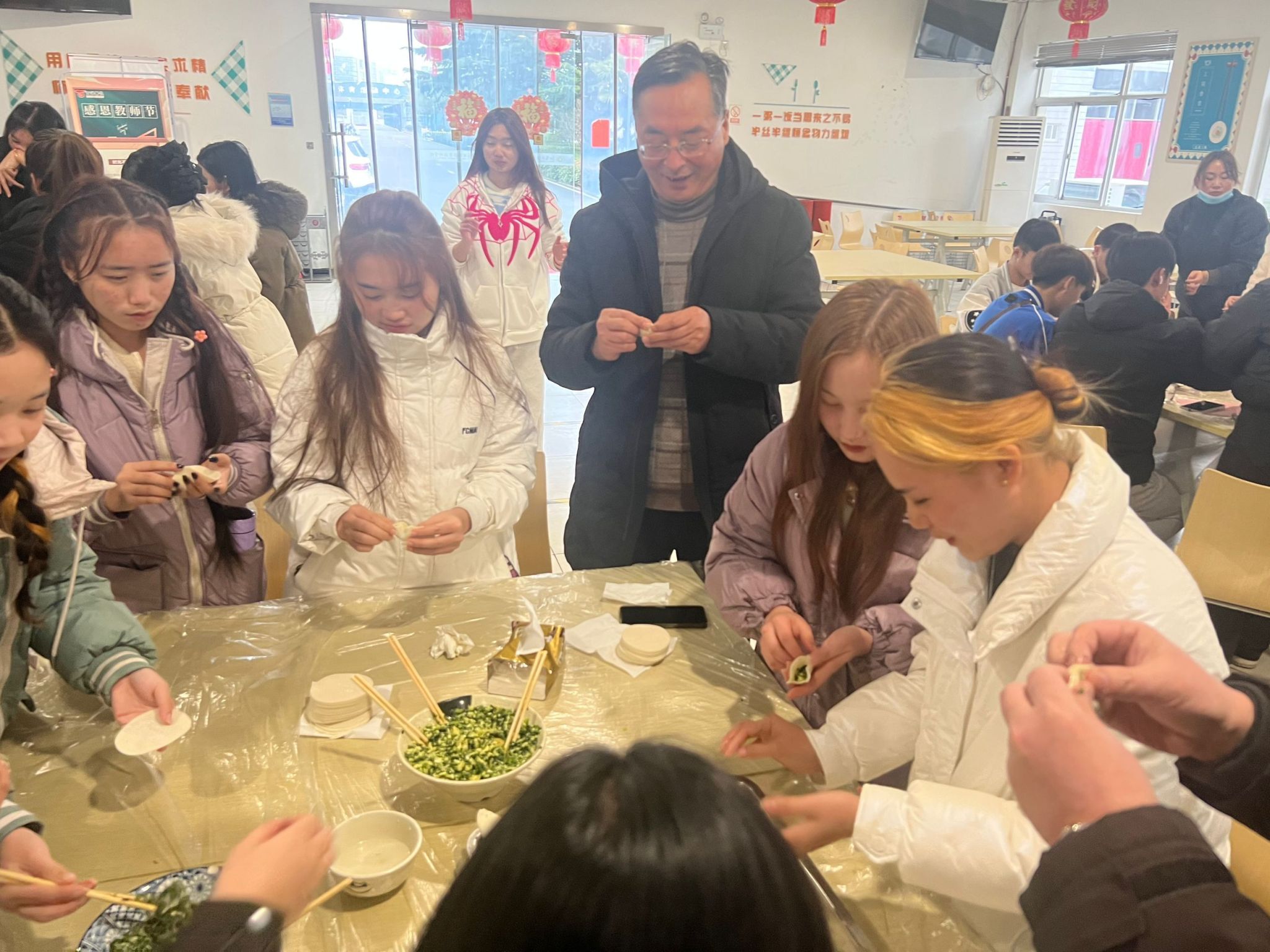 现场还设置了文化体验环节,留学生们在老师的指导下,一同包饺子、写福字。指导老师为大家示范毛笔字的握笔方式、写“福”字的技巧,留学生们在欢声笑语中感受中国传统春节文化的魅力。后勤处阿姨们向大家展示了包饺子的基本技巧和手法,先放馅、后捏边,手把手教学。大家发挥奇思妙想,捏出了形态各异的饺子,沉浸式体验了中国传统美食的制作过程。留学生们吃着亲手制作的饺子,在欢乐中跨越文化、增进友谊。校领导给留学生们赠送了新春礼包和祝福,勉励留学生们来到中国后,在学习专业知识的同时,能够体验中国的传统文化,感受中国的社会习俗、传统习俗,更好地融入工院大家庭。