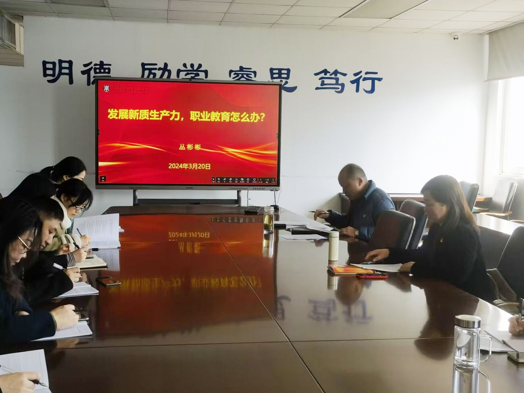 3月20日下午,校党委委员、副校长丛彬彬以“发展新质生产力,职业教育怎么办?”为主题,在崇謇楼601会议室为学工处党支部全体党员讲授专题党课。学工处党支部书记徐明主持党课。