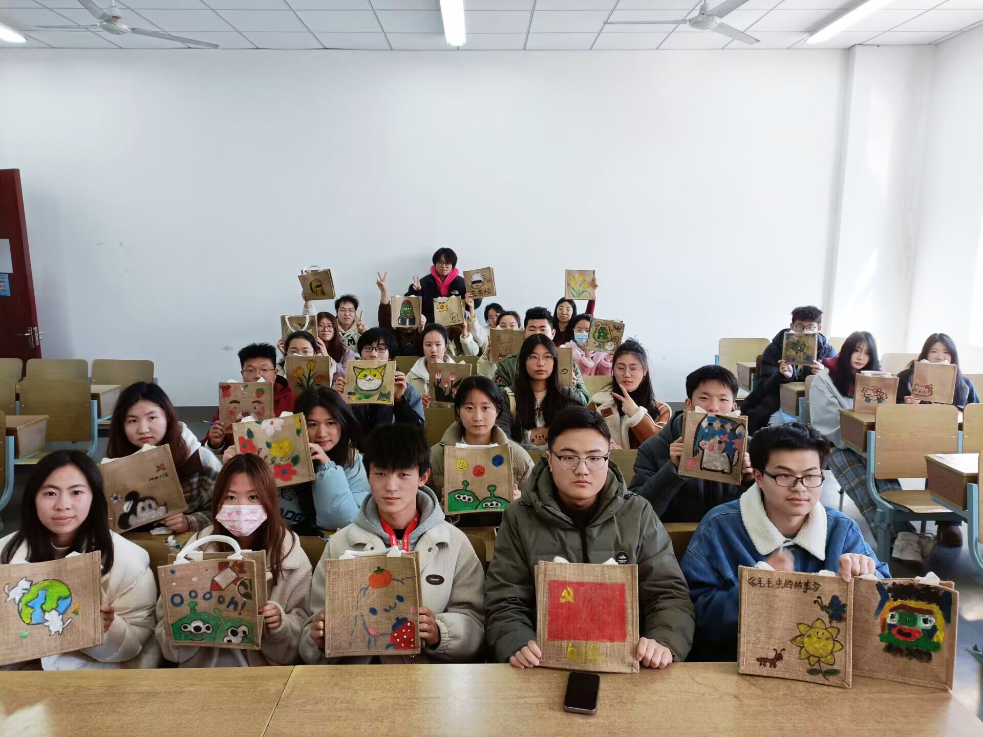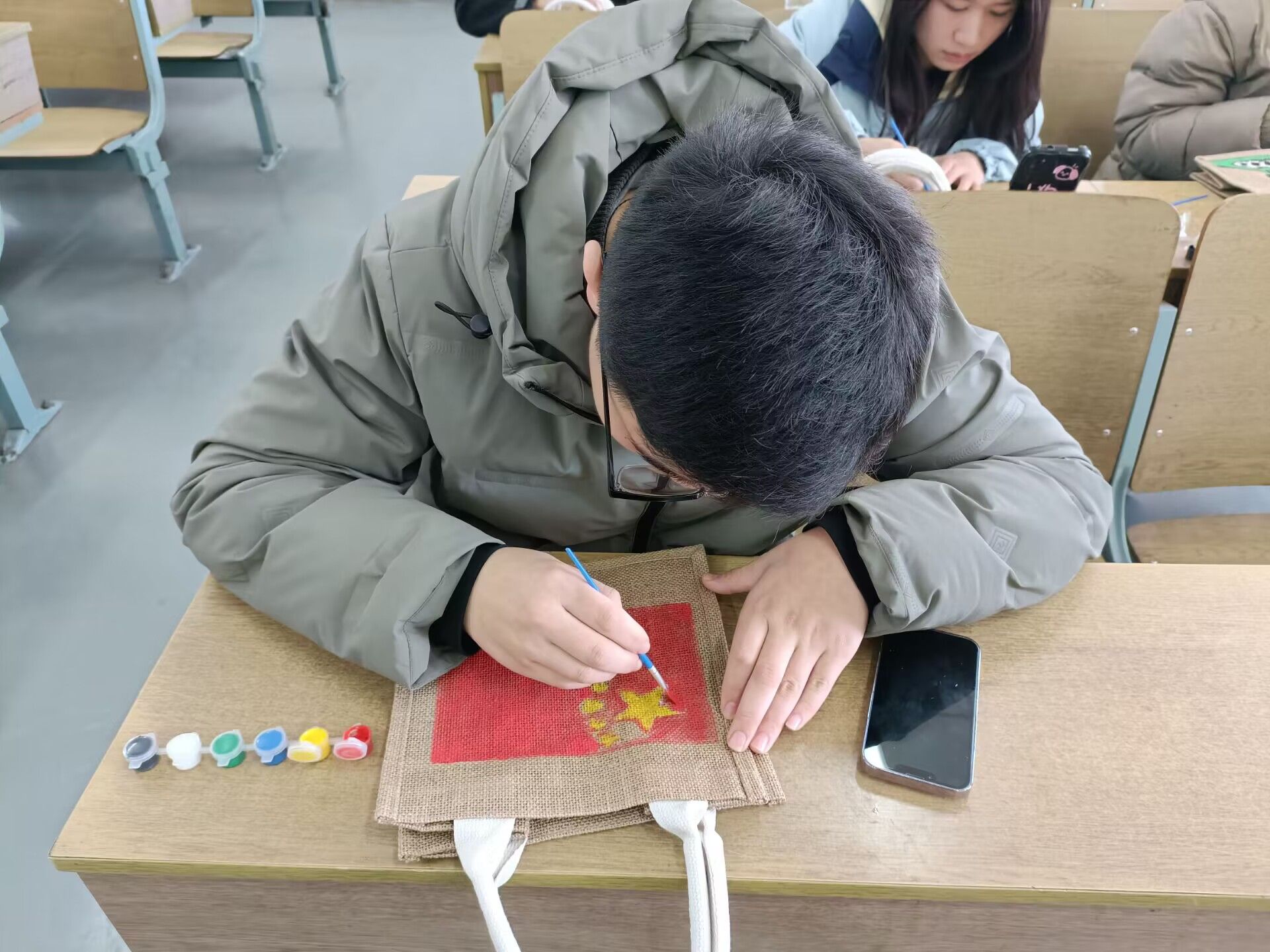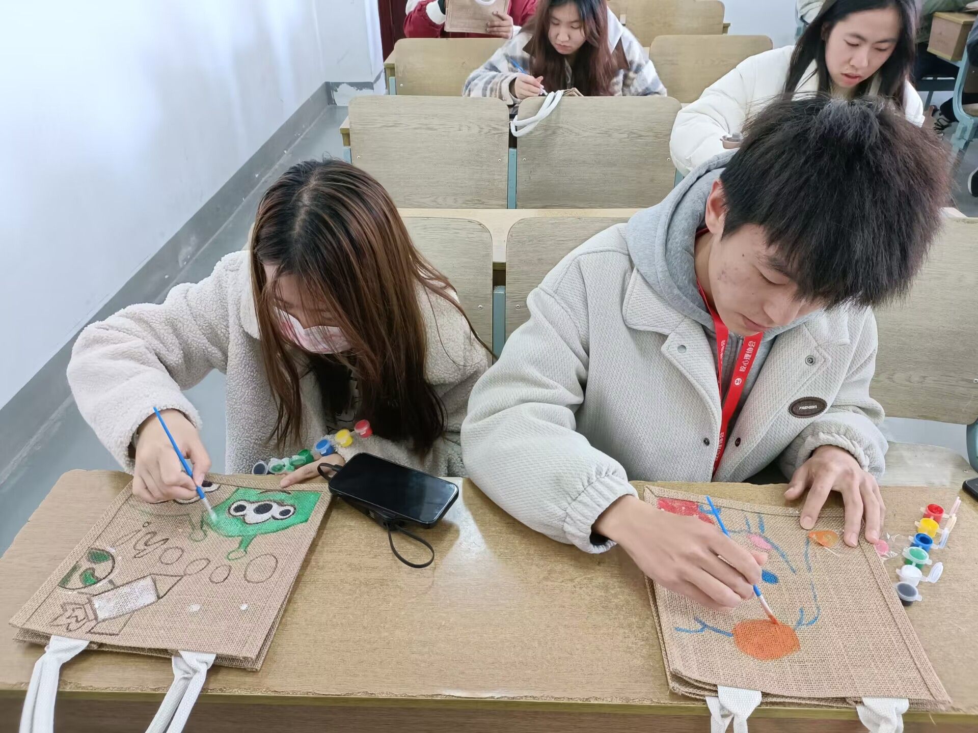 织绣阁刺绣社团指导老师阮洪妮讲解了手绘基本知识、调色技法及绘画操作,在三名专业同学的指导下,同学们尝试在麻布包上绘出心仪的图案,一个个别具特色的创意手绘包在大家手中成型。活动中,同学们听着舒缓的轻音乐,通过画笔表达内心世界,在专注创作的过程中抚平了浮躁,舒缓了压力。