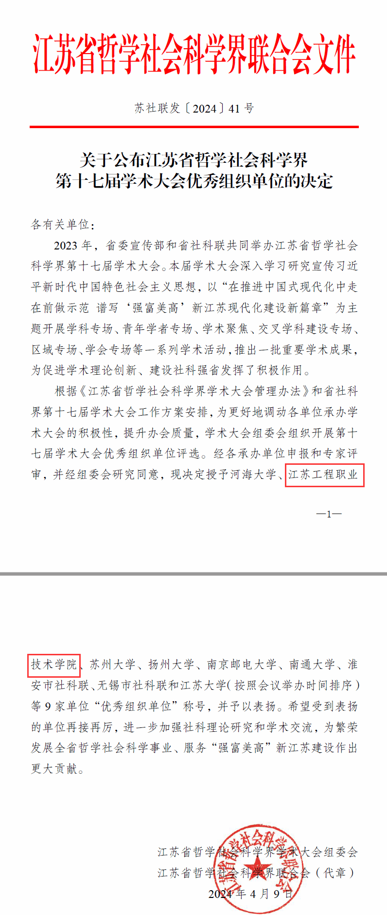4月9日,江苏省哲学社会科学界联合会公布了《关于公布江苏省哲学社会科学界第十七届学术大会优秀组织单位的决定》,我校被授予“优秀组织单位”称号,全省共9所高校(单位)获批。