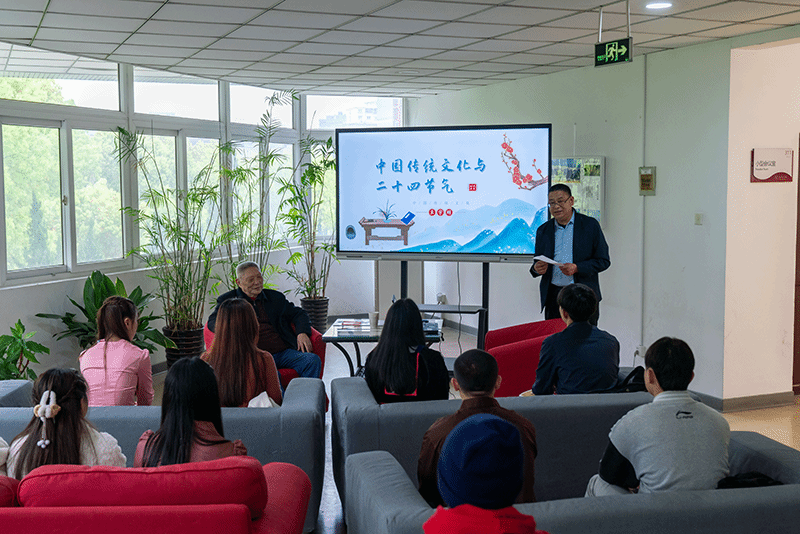 图文信息中心邀请了江苏省民俗学会会员、南通市非物质文化遗产研究会顾问、民俗专家王宇明教授,为留学生们举办了一场生动的中国传统文化讲座。王宇明以“中国传统文化与二十四节气”为题,详细介绍了每个节气的历史背景、自然特征以及与节气相关的民俗活动和饮食习惯。他用讲故事与提问的方式与留学生频频互动,为留学生们带来了的一场内容丰富的中国传统文化大餐。