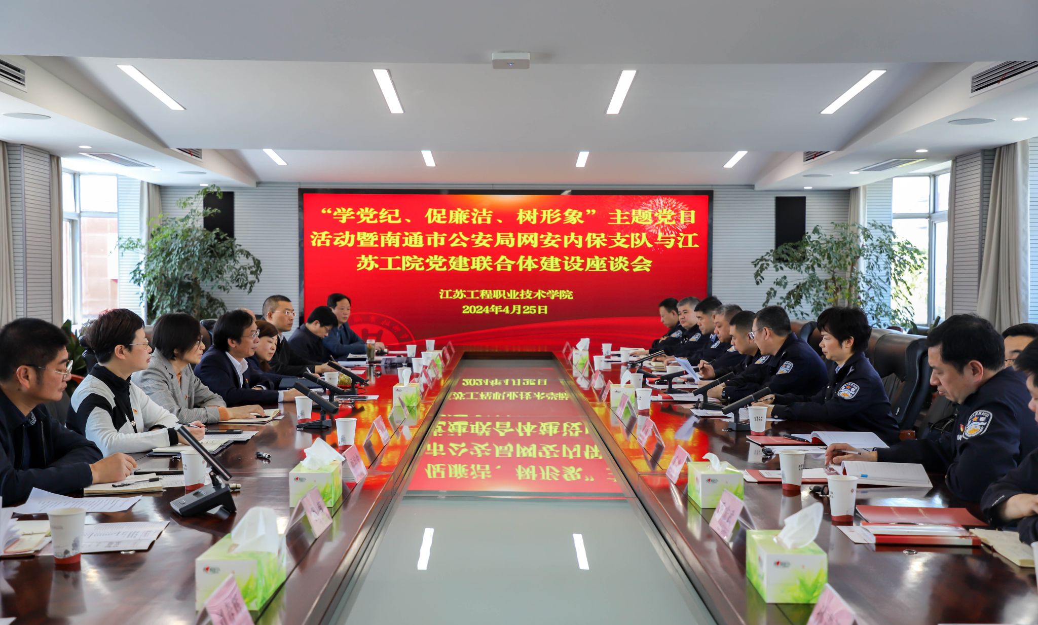 为扎实推进党纪学习教育走深走实,结合“5·10”思廉日系列活动,4月25日上午,我校与南通市公安局网安内保支队在行政楼第一会议室开展“学党纪、促廉洁、树形象”主题党日活动暨党建联合体建设座谈会。南通市公安局单位内部安全保卫支队政委陶亚、网络安全保卫支队副政委王红星,我校党委书记秦志林,党委委员、副校长丛彬彬,党委委员、组织部部长仲岑然出席活动。