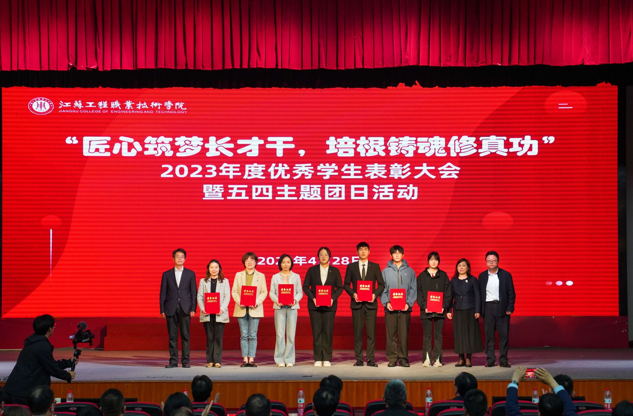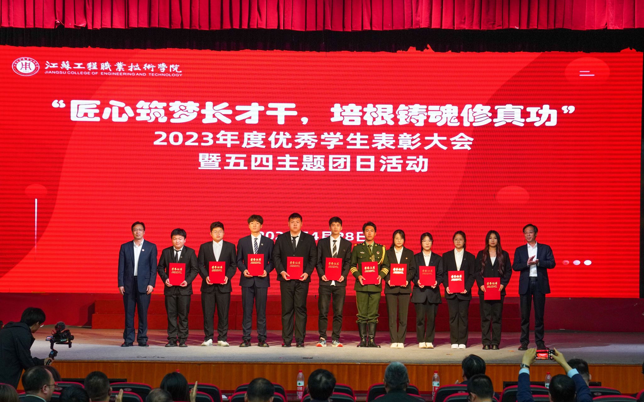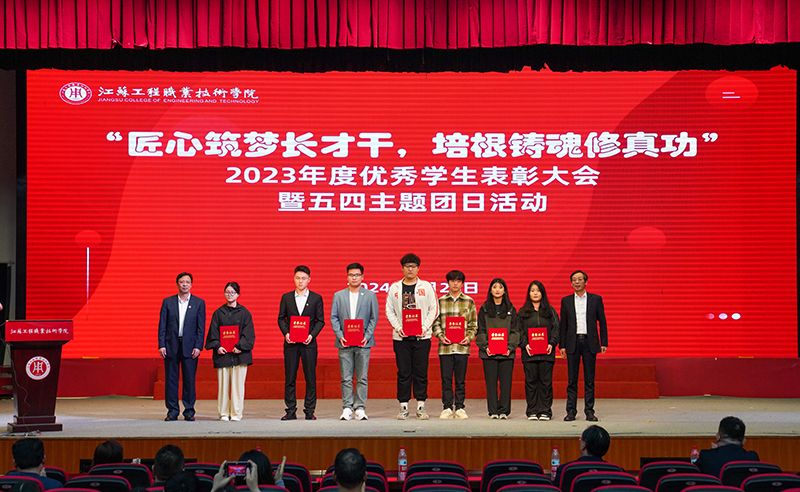 4月28日下午,“匠心筑梦长才干,培根铸魂修真功”2023年度优秀大学生表彰大会暨五四主题团日活动在我校崇川校区大礼堂举行。校党委书记秦志林,党委副书记、校长张忠,党委副书记邓海龙,党委委员、副校长丛彬彬,党委委员、副校长孙兵,党委委员、纪委书记(监察专员)顾剑锋,党委委员、副校长郭江峰,党委委员、宣传部部长王希颖出席大会。学校相关党政职能部门领导,各二级学院(部)党政领导、指导教师代表、辅导员、班主任以及700余名学生代表相聚一堂,共同见证和庆祝属于工院优秀学子的荣耀时刻。本次大会由党委学工部、团委联合主办,15000多名师生、学生家长在线观看了现场实况网络直播。