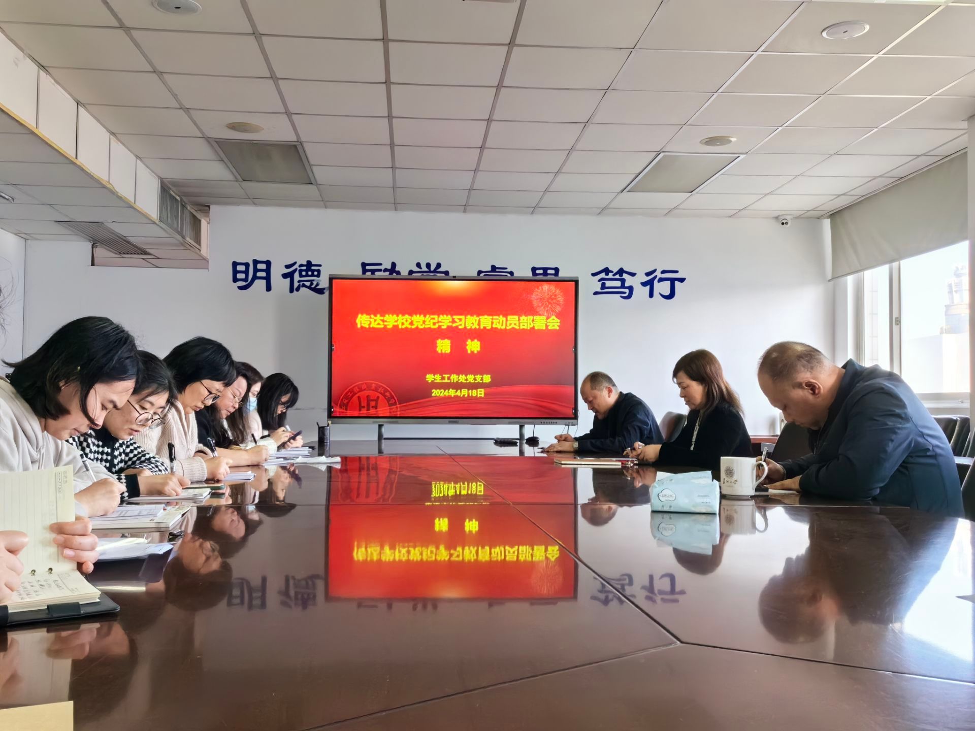 为深入贯彻落实上级关于开展党纪学习教育的要求,持续强化党员干部的党性修养和纪律观念,4月18日,学工处党支部在崇謇楼601会议室开展主题党日活动,部署支部党纪学习教育工作。副校长丛彬彬和支部全体党员参与了本次活动,活动由支部书记徐明主持。