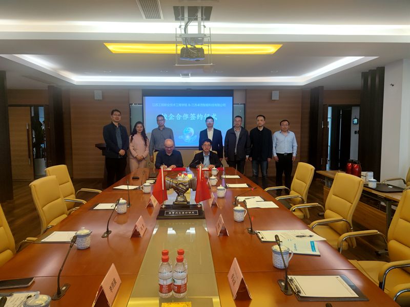 江苏卓茂智能科技有限公司总经理陈建忠回顾了校企合作的历史,针对当前形势,介绍了企业如何转型升级,发展新质生产力,成为创新型高科技企业的路径与规划。郭江峰介绍了学校发展历程和基本情况,并就校企双方在科技研发、人才共享、学生实习就业等领域进一步深化合作提出了思路和建议。杨化奎简要介绍了建筑工程学院的专业设置、师资队伍与人才培养等情况。双方围绕学生专业核心能力培养、实习就业岗位拓展、丰富校企合作内涵、科技成果转化等内容进行交流,达成共识。现场双方签订了校企合作协议,举行了“校企合作基地”授牌仪式。