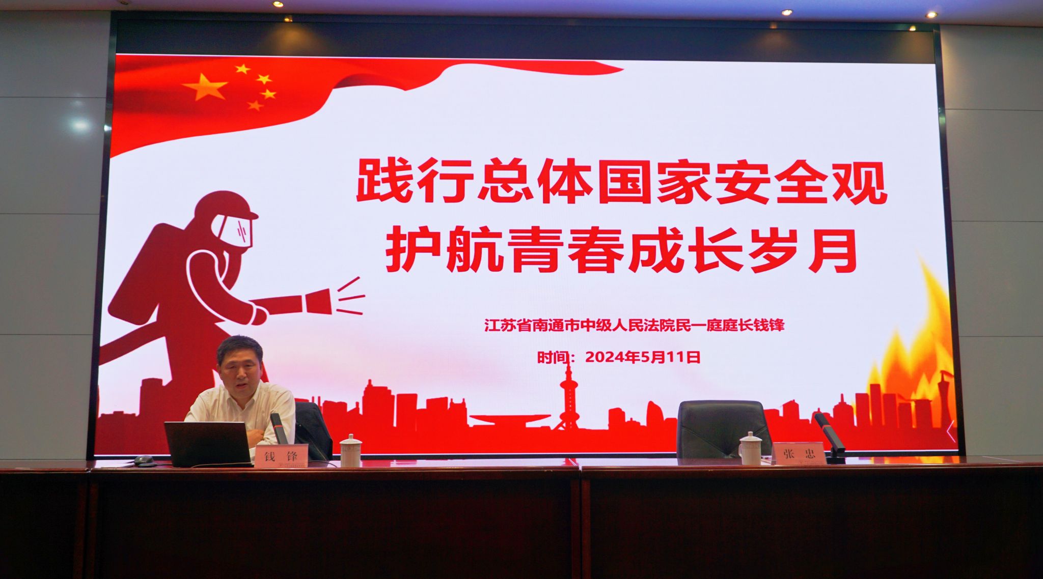 5月6日至5月12日是第六届全省青少年法治宣传教育周,为进一步加强青少年法治宣传教育,增强我校师生的法治观念和安全意识,我校法治副校长、南通市中级人民法院民一庭庭长钱锋于5月11日下午走进校园,在致知楼报告厅开展以《践行总体国家安全观 护航青春成长岁月》为主题的宣讲。党委副书记、校长张忠主持宣讲会,各职能部门、二级学院教职工代表和学生代表近三百人参加宣讲会。