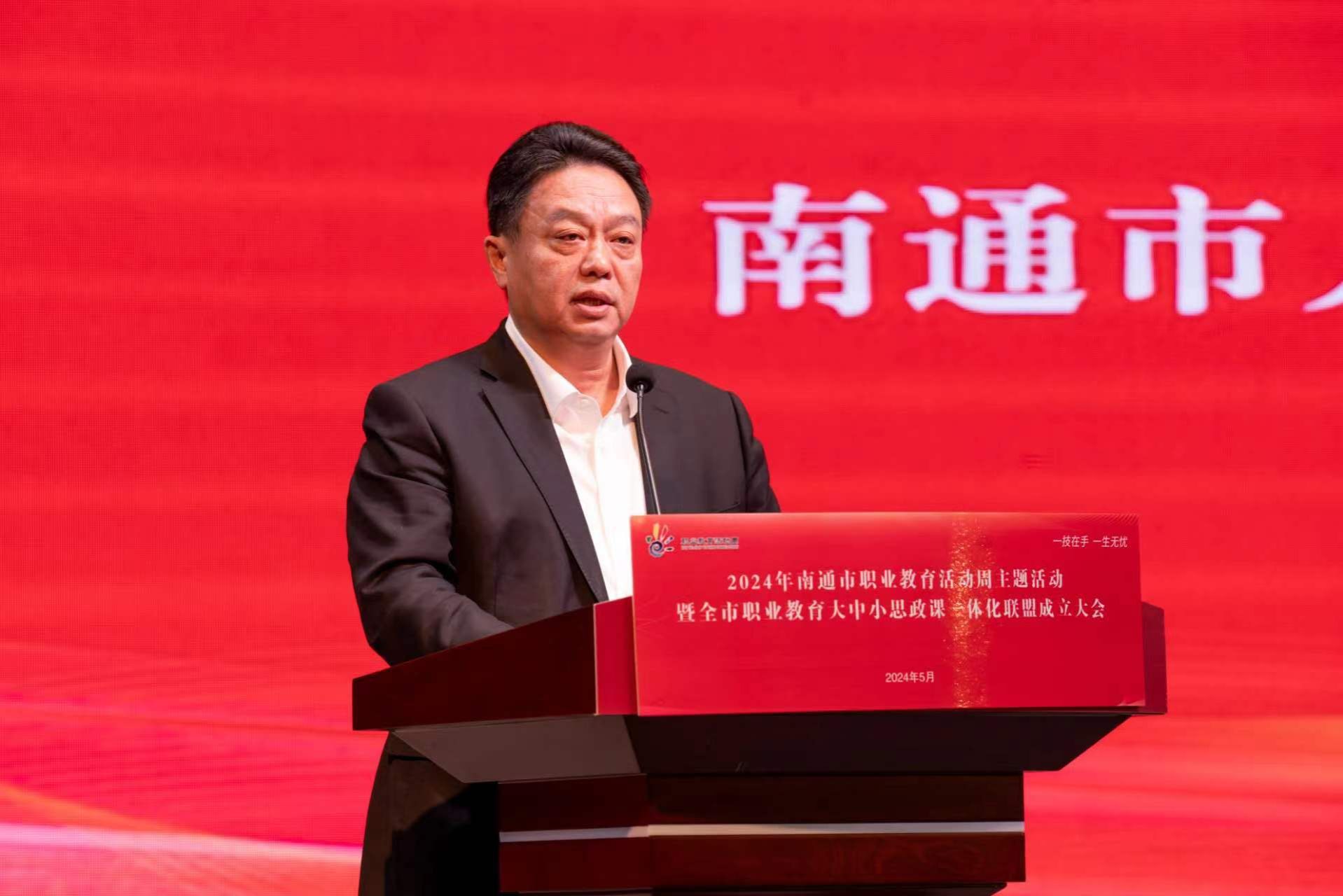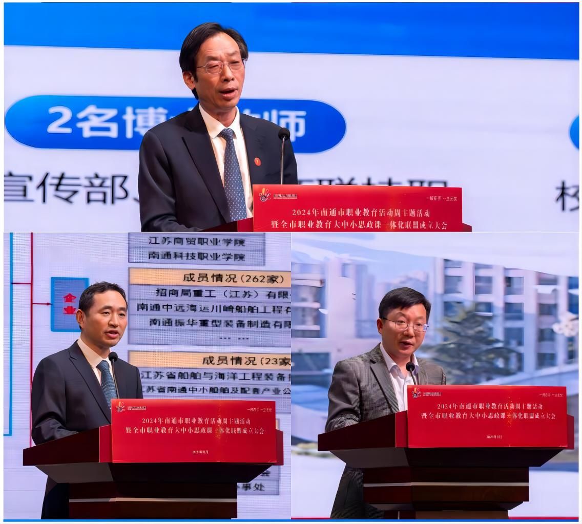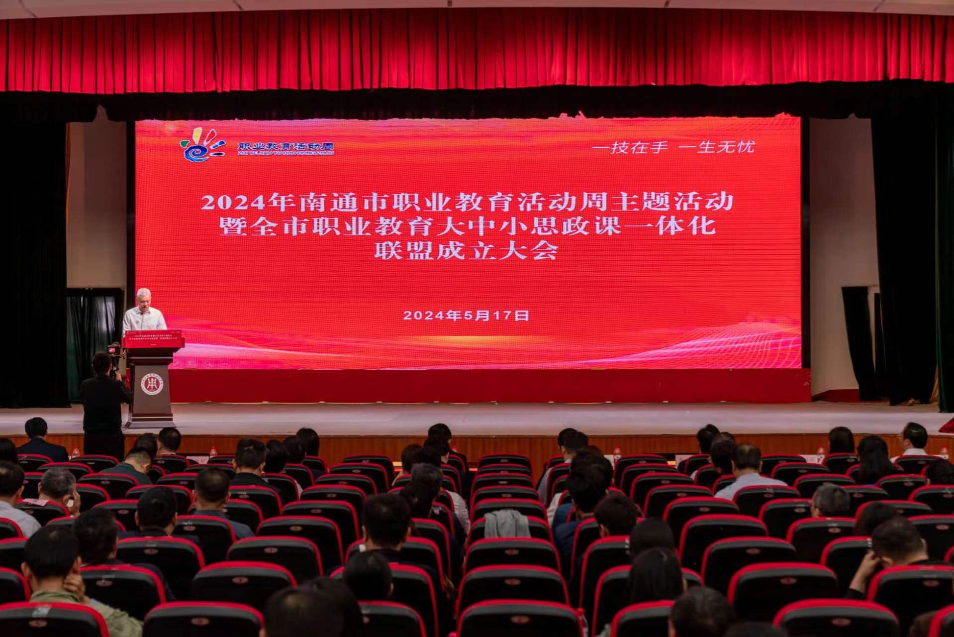 校党委书记秦志林在致辞中表示,在南通市构建产业、专业、就业“三业”联通、教育链、人才链、产业链、创新链“四链”融合的特色现代职业教育体系中,我们深感使命光荣、责任重大。职业教育活动周期间成立南通市职业教育大中小思政课一体化联盟,旨在通过进一步加强平台、课程群与师资团队建设,推进小学、初中、高中、高职教育各阶段之间思政课纵向衔接、逐层递进、协同育人,深化南通市职业教育改革创新,促进人才培养更好地适应地方经济社会发展的需要。