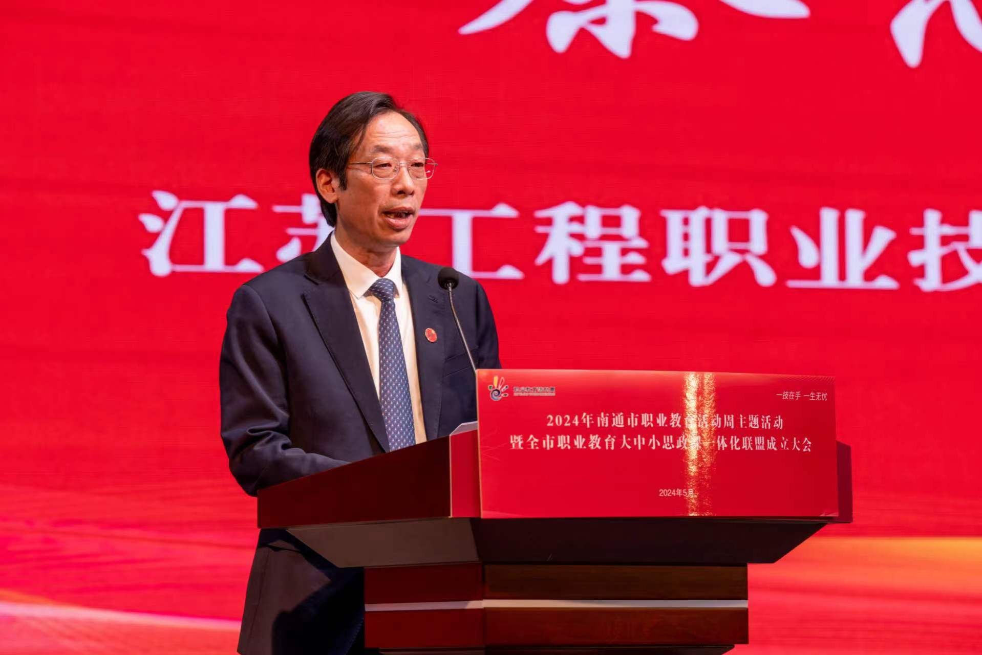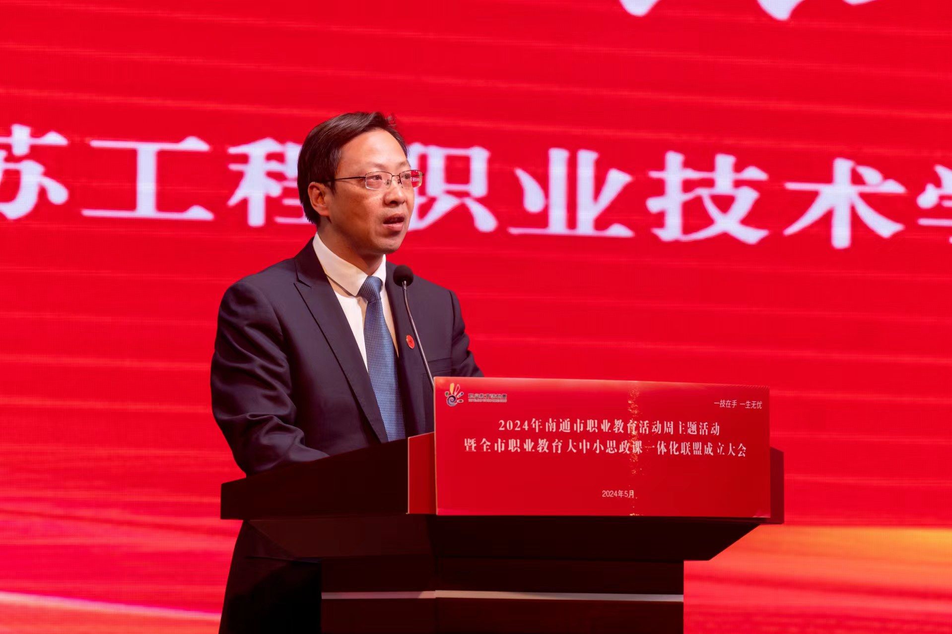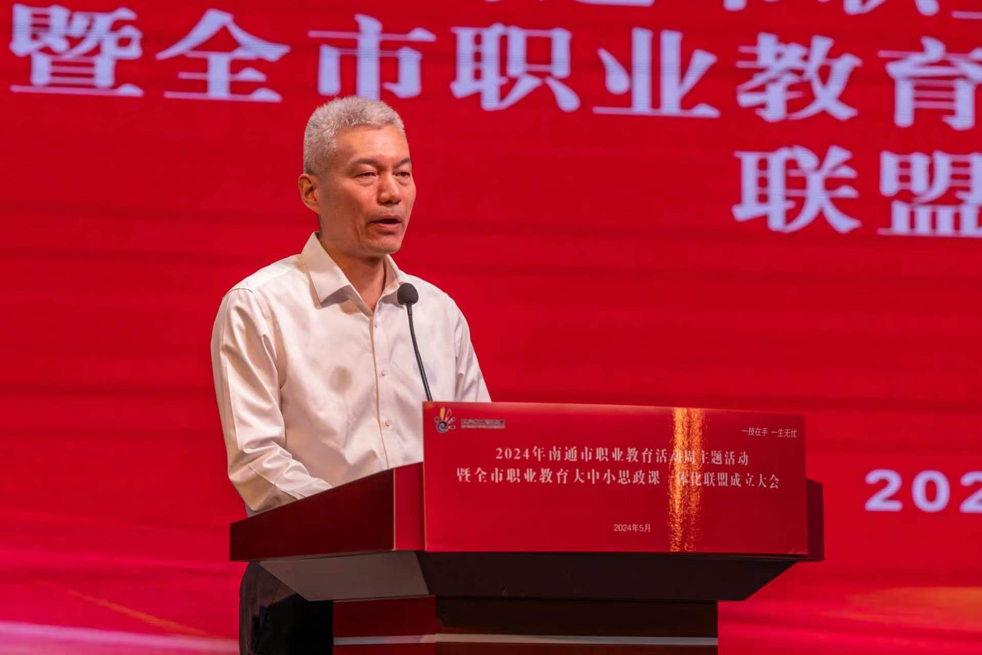 校党委书记秦志林在致辞中表示,在南通市构建产业、专业、就业“三业”联通、教育链、人才链、产业链、创新链“四链”融合的特色现代职业教育体系中,我们深感使命光荣、责任重大。职业教育活动周期间成立南通市职业教育大中小思政课一体化联盟,旨在通过进一步加强平台、课程群与师资团队建设,推进小学、初中、高中、高职教育各阶段之间思政课纵向衔接、逐层递进、协同育人,深化南通市职业教育改革创新,促进人才培养更好地适应地方经济社会发展的需要。