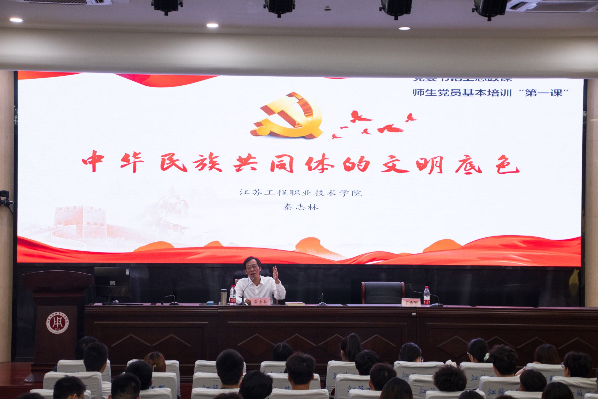 5月29日下午,校党委书记秦志林以《中华民族共同体的文明底色》为题在海门校区大学生活动中心二楼报告厅讲授专题思政课暨师生党员基本培训“第一课”。校党委委员、党委宣传部部长王希颖主持报告会。