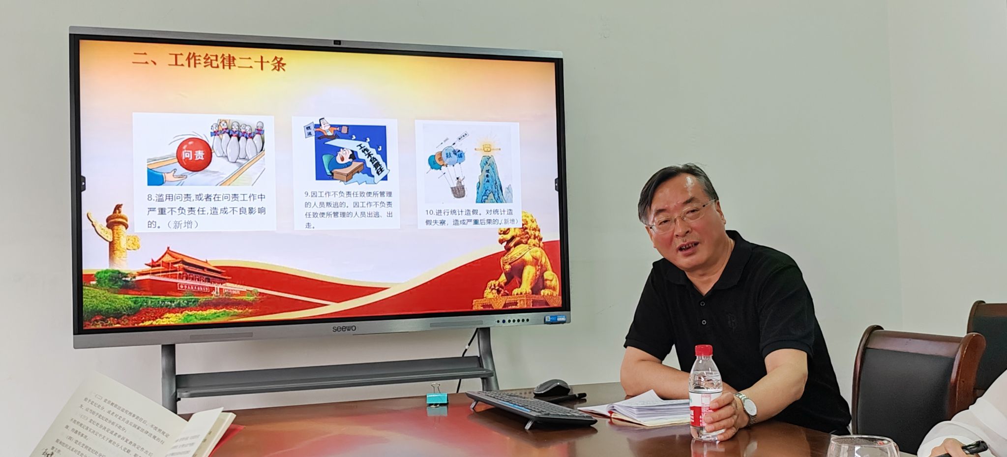 6月4日下午,校党委副书记邓海龙在崇实楼202会议室以《把工作纪律贯穿干事创业始终》为题,讲授党纪学习教育专题党课。联合一党支部书记储玲主持,全体支部党员到会学习。