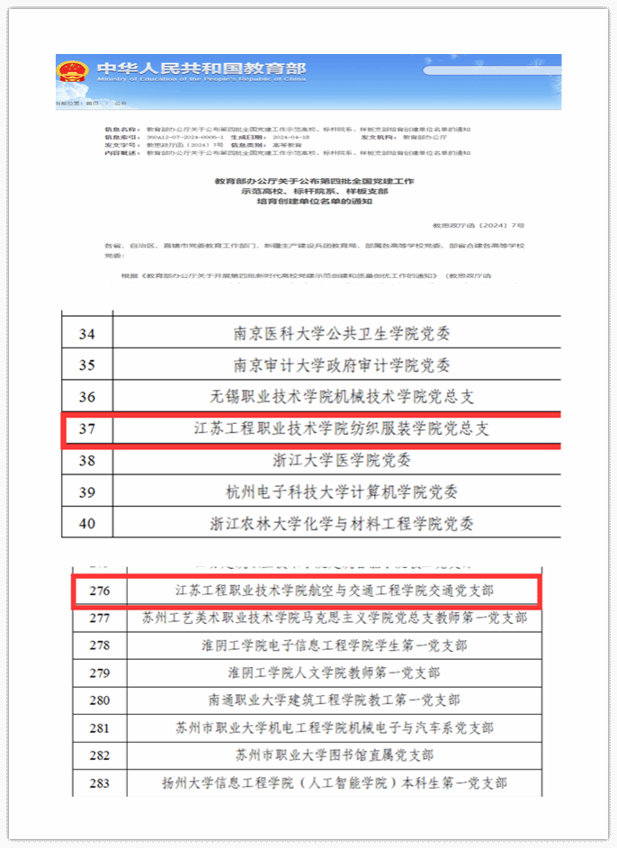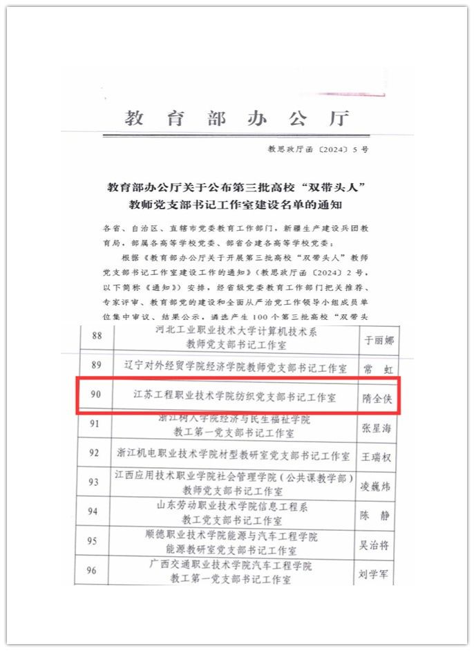 近日,教育部办公厅公布了第四批新时代高校党建示范创建和质量创优工作(简称“双创”)培育创建单位和第三批高校“双带头人” 教师党支部书记工作室建设单位。我校纺织服装学院党总支入选全国党建工作标杆院系培育创建单位,航空与交通学院交通党支部入选全国党建工作样板支部培育创建单位,纺织服装学院党总支纺织支部隋全侠书记工作室入选全国党建工作“双带头人”支部书记工作室。“三朵金花同落工院”,我校成为江苏省唯一实现三个门类同时获批的高职院校。