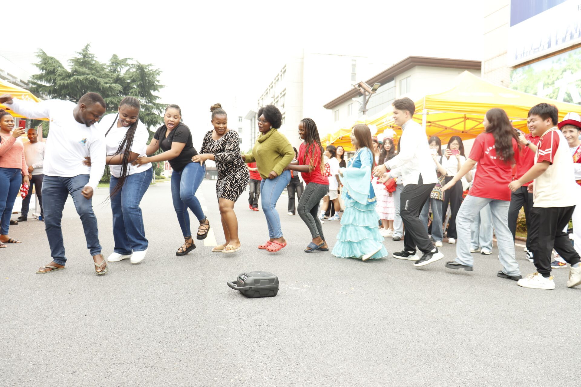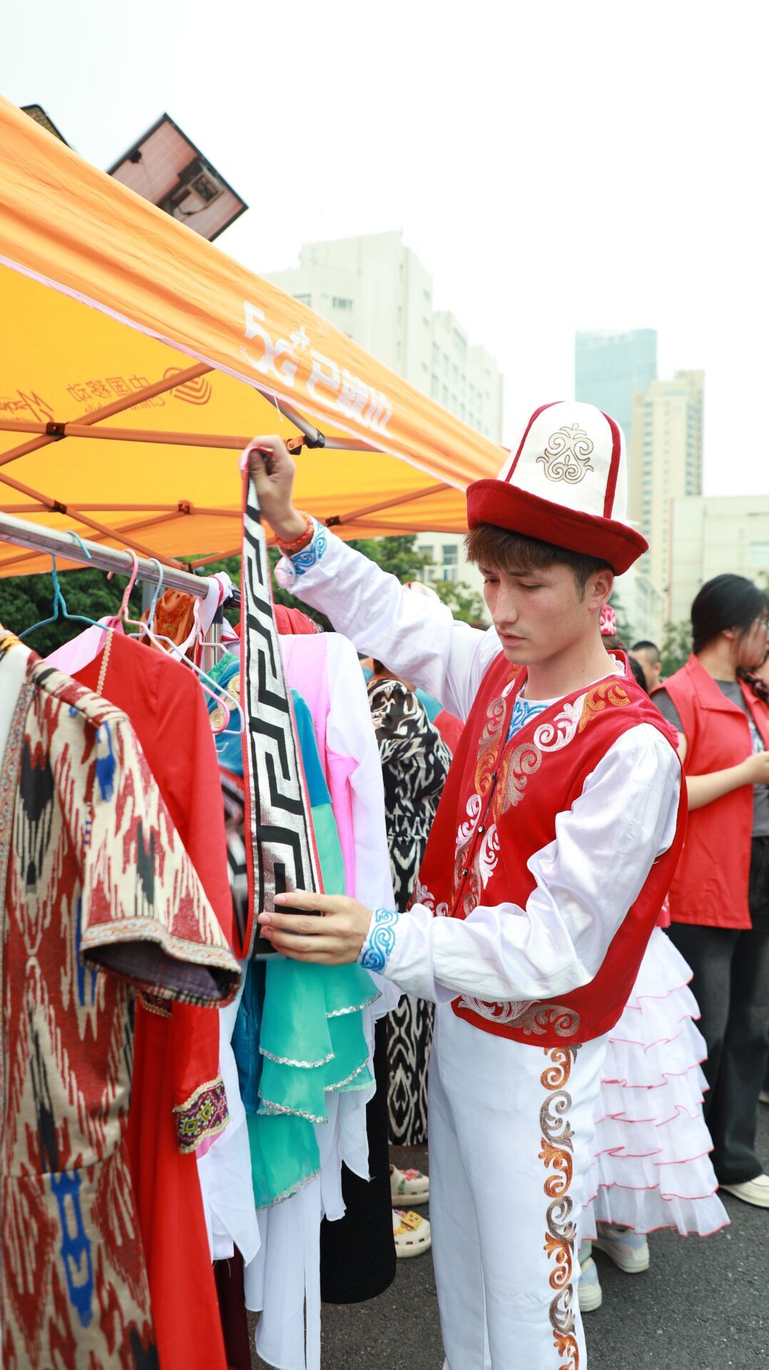 在民俗集市巴扎中增进民族融合。精美绝伦的手工艺品、令人食指大动的特色美食、乐声动听的民族乐器、绚丽多彩的民族服饰,吸引了我校中国及老挝、南非留学生的驻足体验,热情动感的新疆歌舞表演,瞬间点燃全场气氛,学校领导和汉族学生、少数民族学生以及留学生载歌载舞,亲身感受新疆歌舞表演魅力,在交融中结下深厚的民族认同和青年友谊。