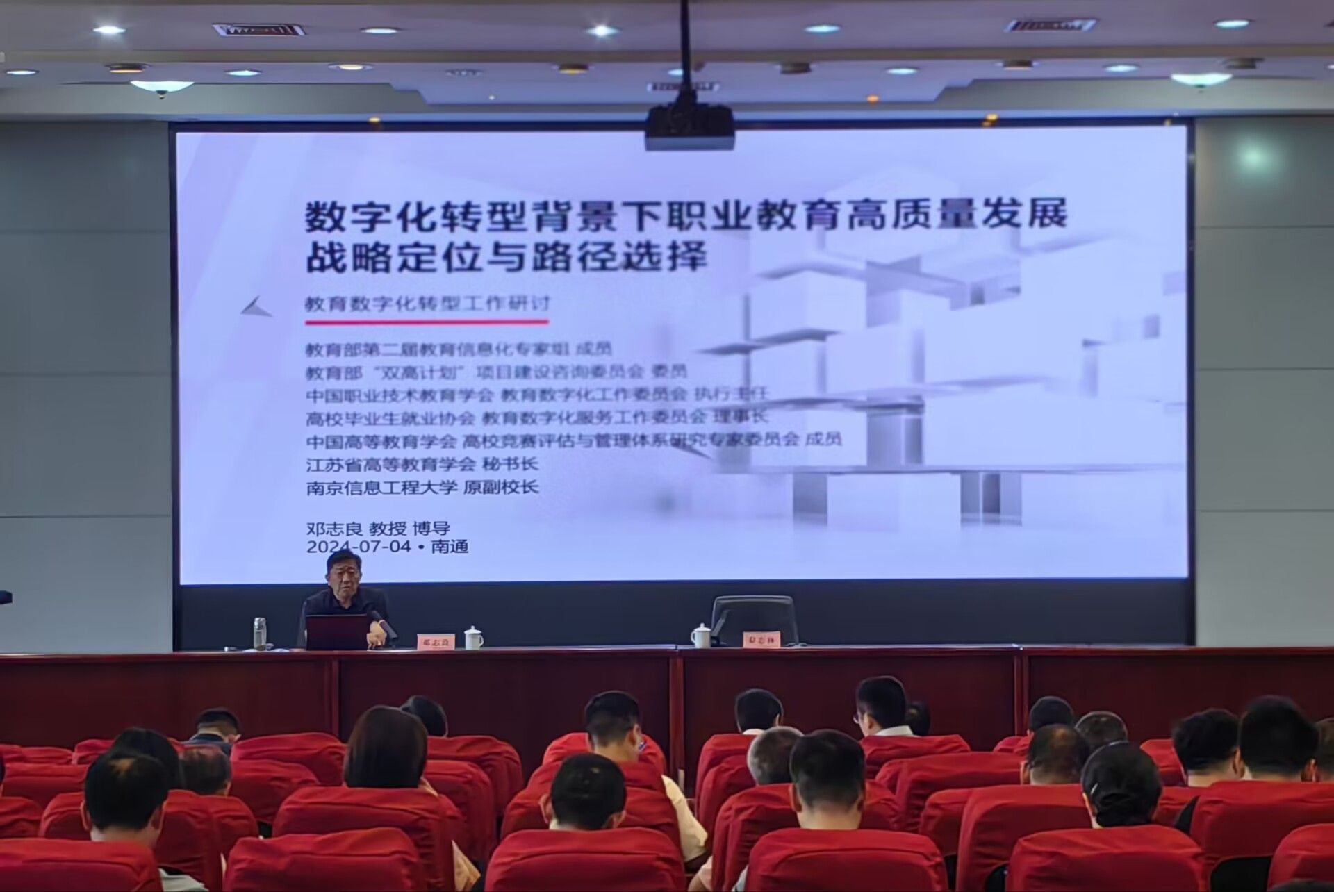 7月4日下午,学校特邀江苏省高等教育学会秘书长邓志良来校作《数字化转型背景下职业教育高质量发展战略定位与路径选择》专题报告。报告会由校党委书记秦志林主持,党委副书记、校长张忠等校领导出席。学校中层干部、教研室主任、专业负责人及部分专业骨干教师参加会议。