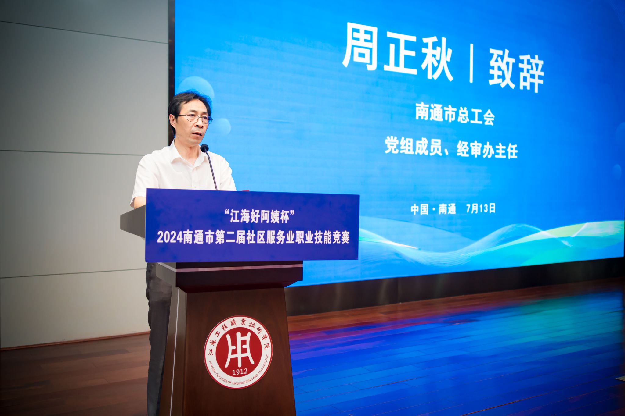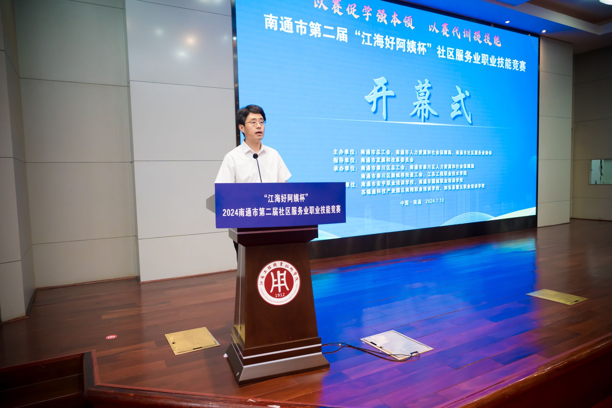 7月13日,南通市第二届“江海好阿姨杯”社区服务业职业技能竞赛在我校举办。本次大赛由南通市总工会、南通市人社局、南通市社区服务业协会主办。南通市人社局党组成员、副局长朱为民,南通市总工会党组成员、经审办主任周正秋,南通市社区服务业协会会长康爱勤等领导出席开幕式。我校校长张忠出席开幕式并致辞,副校长郭江峰主持开幕式。