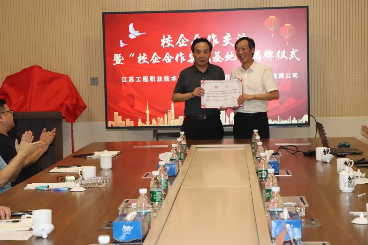 与会人员就人才培养定位、岗位需求、学生实习就业、教师技术服务等内容进行了广泛交流并达成共识。秦志林为薛辉颁发了江苏省产业教授聘书,并与陈建国共同为我校与南通二建集团校企合作实训基地揭牌。