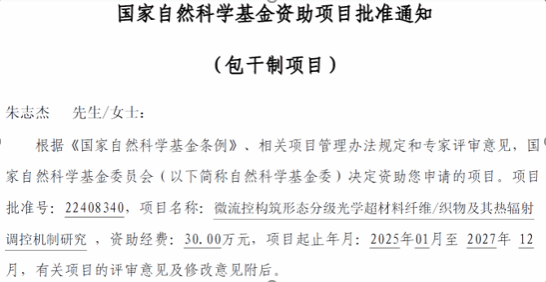 8月23日,国家自然科学基金委员会公布了2024年度国家自然科学基金申请项目评审结果。我校纺织服装学院教师朱志杰博士申报的《微流控构筑形态分级光学超材料纤维/织物及其热辐射调控机制研究》项目获得青年科学基金项目资助,资助金额30万元。这是我校自然科学基金项目申报的重大突破。