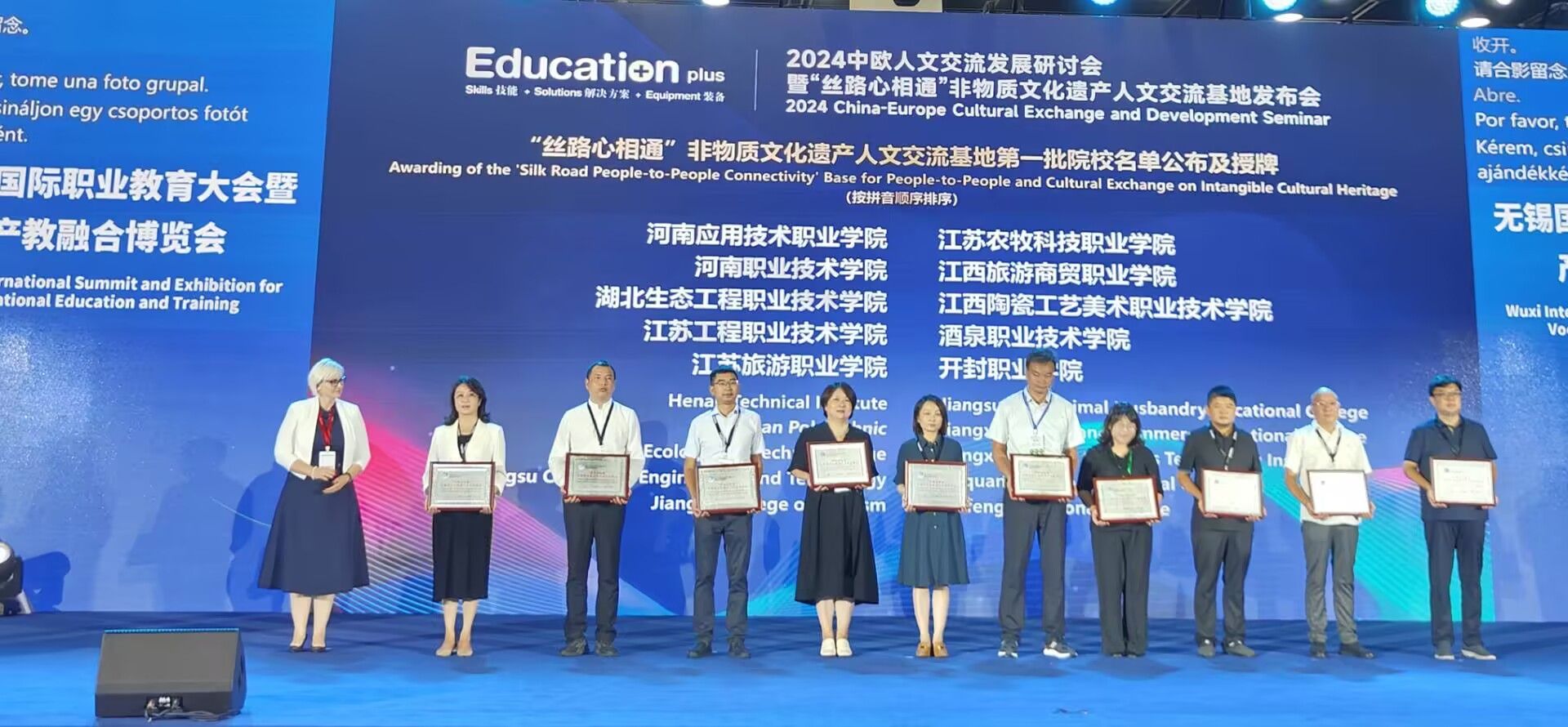 近日,2024 Education Plus(第八届)中国(无锡)国际职业教育大会暨产教融合博览会在江苏无锡召开。会上公布了第一批“丝路心相通”非物质文化遗产人文交流基地名单,我校成功入选。