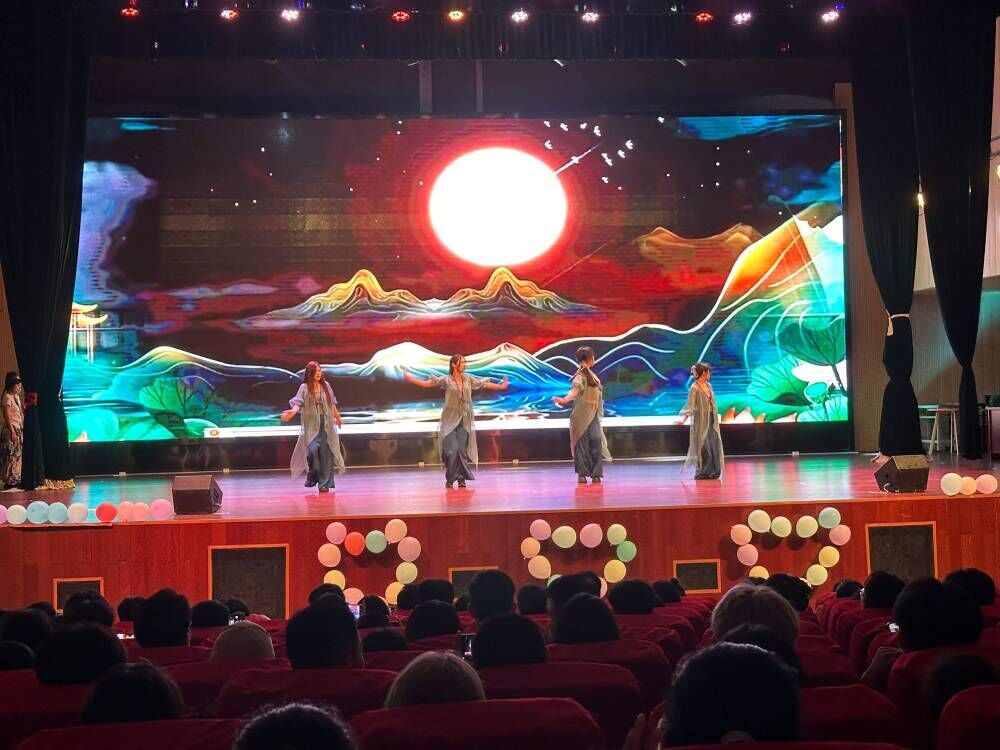 晚会在开场舞《月舞中秋韵》中拉开帷幕。歌曲《青花瓷》以悠扬旋律体现了传统文化与现代音乐的完美结合;晚会小游戏“猜灯谜”和“飞花令”互动抽奖环节更是将现场的气氛推至高潮;诗朗诵《月光下的中国》深情表达了浓厚的家国情怀,现场掌声不断;幕布剧表演将助学贷款与绿色通道具体内容巧妙融入剧情,以寓教于乐的方式使得国家资助政策深入人心,赢得观众的热烈反响。晚会尾声,身着玩偶服的工作人员为在场师生分发月饼,大家合影留念。
