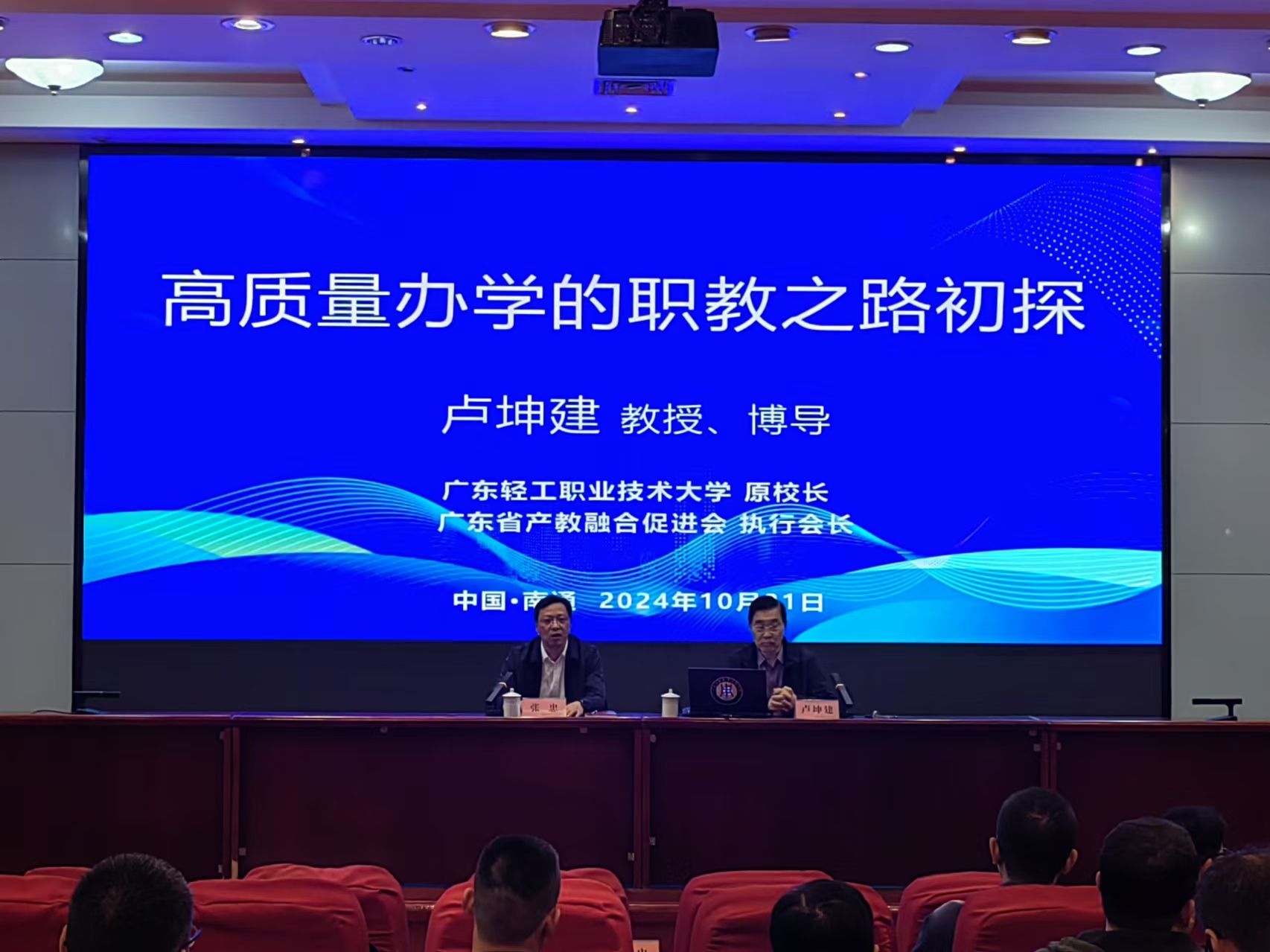 10月31日下午,广东轻工职业技术大学原校长、广东省产教融合促进会执行会长卢坤建教授应邀来校作《高质量办学的职教之路初探》专题讲座。校党委副书记、校长张忠主持会议并讲话。党委委员、副校长郭江峰出席会议。学校中层干部、教研室主任、专业负责人及部分专业骨干教师参加会议。