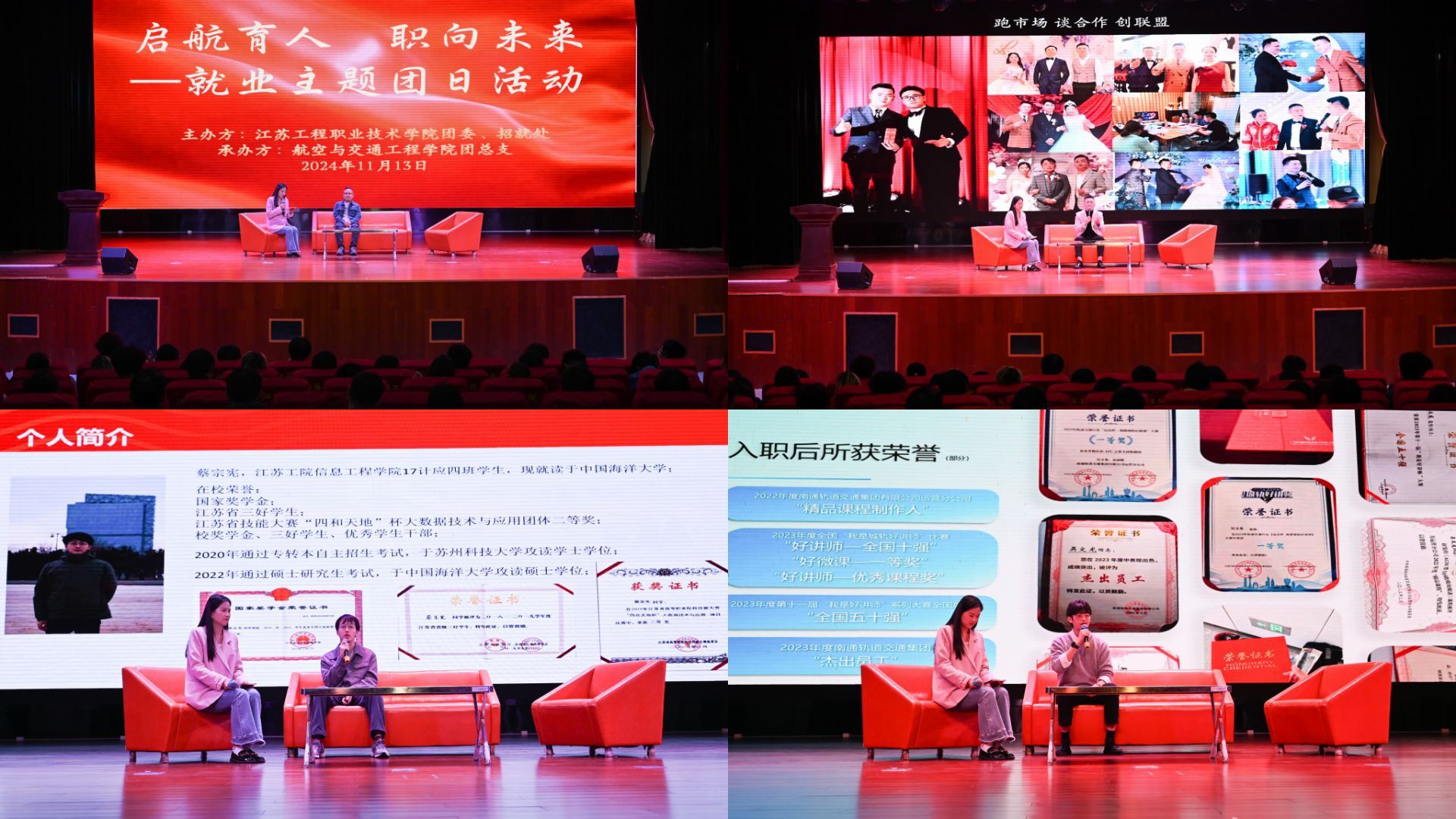 活动邀请了7个二级学院9位优秀毕业生分别作为基层、创业、考研、就业典型分享他们的成长故事。经验分享环节,基层代表、海门街道三南村定制村干、经济管理学院20电商四班毕业生杨镇华,海门港新区包场村、包新街区党总支副书记、建筑工程学院13工程造价班毕业生张佼结合自己的基层工作经历,与同学们交流了作为乡村振兴基层建设者的成长感悟;万言摄影工作室创始人、视觉中国签约摄影师、艺术工程学院21艺设三六班毕业生方謇文,万言摄影工作室合伙人、视觉中国签约摄影师、21艺设一班毕业生倪黄鑫,原力主持工作室联合创始人、智能制造学院20机电五六班毕业生李猛作为创业代表介绍了创业政策,分享了创业途中的宝贵经验;安徽科技工程大学研究生、经济管理学院18营销二班毕业生徐沈伟,中国海洋大学研究生、信息工程学院17计应四班毕业生蔡宗宪介绍了自己的学习经历和转本考研的上岸秘诀;普米斯生物制药(南通)有限公司微生物副主管、纺织服装学院13工分班毕业生朱亚楠,南通轨道交通集团有限公司运营分公司AFC中央维护员、航空与交通工程学院18城轨机电班毕业生吴文龙讲述了自己的成长路径以及新时代大学生素质提升方法,号召同学们找到人生方向,明确奋斗目标,认真做好学业规划和职业生涯规划,勇于突破舒适圈,不断扩大自我能力范畴,在奋斗中实现人生价值。