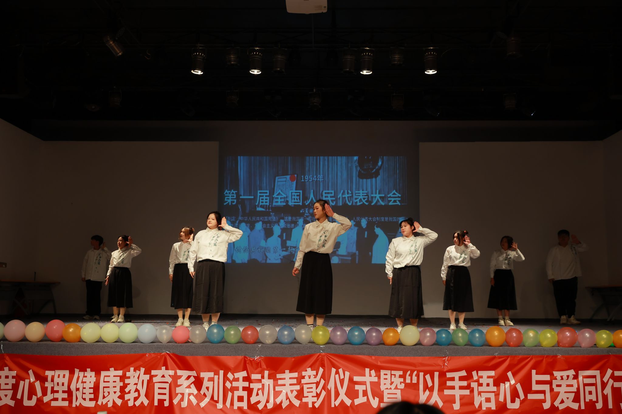 表彰结束后,激动人心的手语操大赛拉开帷幕。7个学院和大学生心理协会共计派出16支代表队参加了本次比赛。比赛中,参赛队员情绪饱满,动作整齐流畅,精神面貌热情饱满,演绎了校园生活、青春梦想、家国情怀等主题,赢得了场下阵阵掌声。经过激烈的角逐,艺术设计学院的《大梦想家》和智能制造学院的《一起向未来》荣获一等奖。