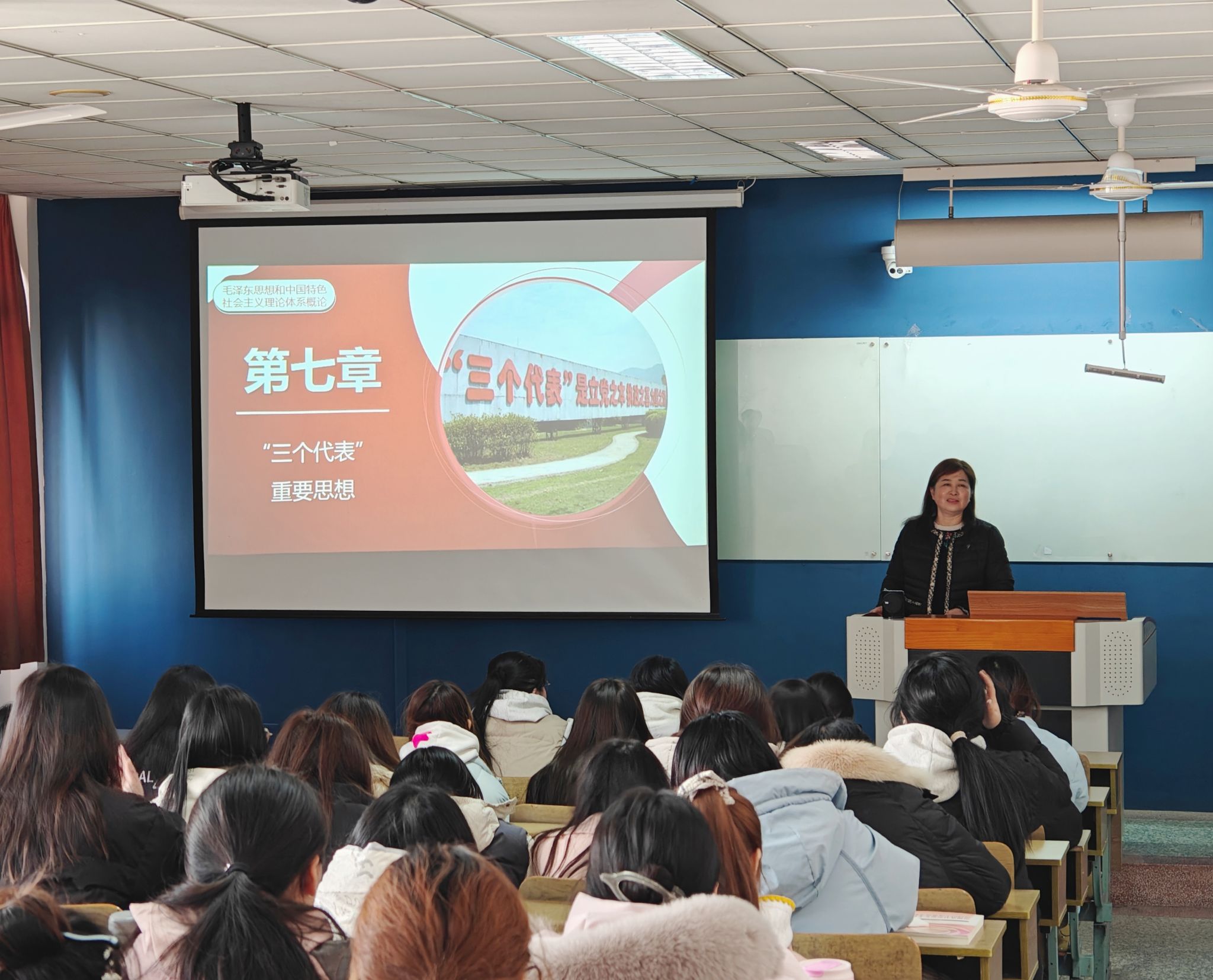 12月16号下午,校党委委员、副校长丛彬彬在崇川校区致知楼406教室为纺织服装学院23服装六八九班的同学们讲授了《毛泽东思想和中国特色社会主义理论体系概况》第七章“‘三个代表’”重要思想专题。课上,丛彬彬介绍了江泽民同志的生平与贡献、“三个代表”重要思想产生的历史背景以及酝酿创立过程和深刻内涵,深刻阐述了从党的十三届四中全会到党的十六大的13年中党和国家取得的巨大成就,号召同学们感党恩、听党话、跟党走,将个人理想追求融入到党和国家的事业当中,在实现伟大中国梦的生动实践中彰显青春风采。