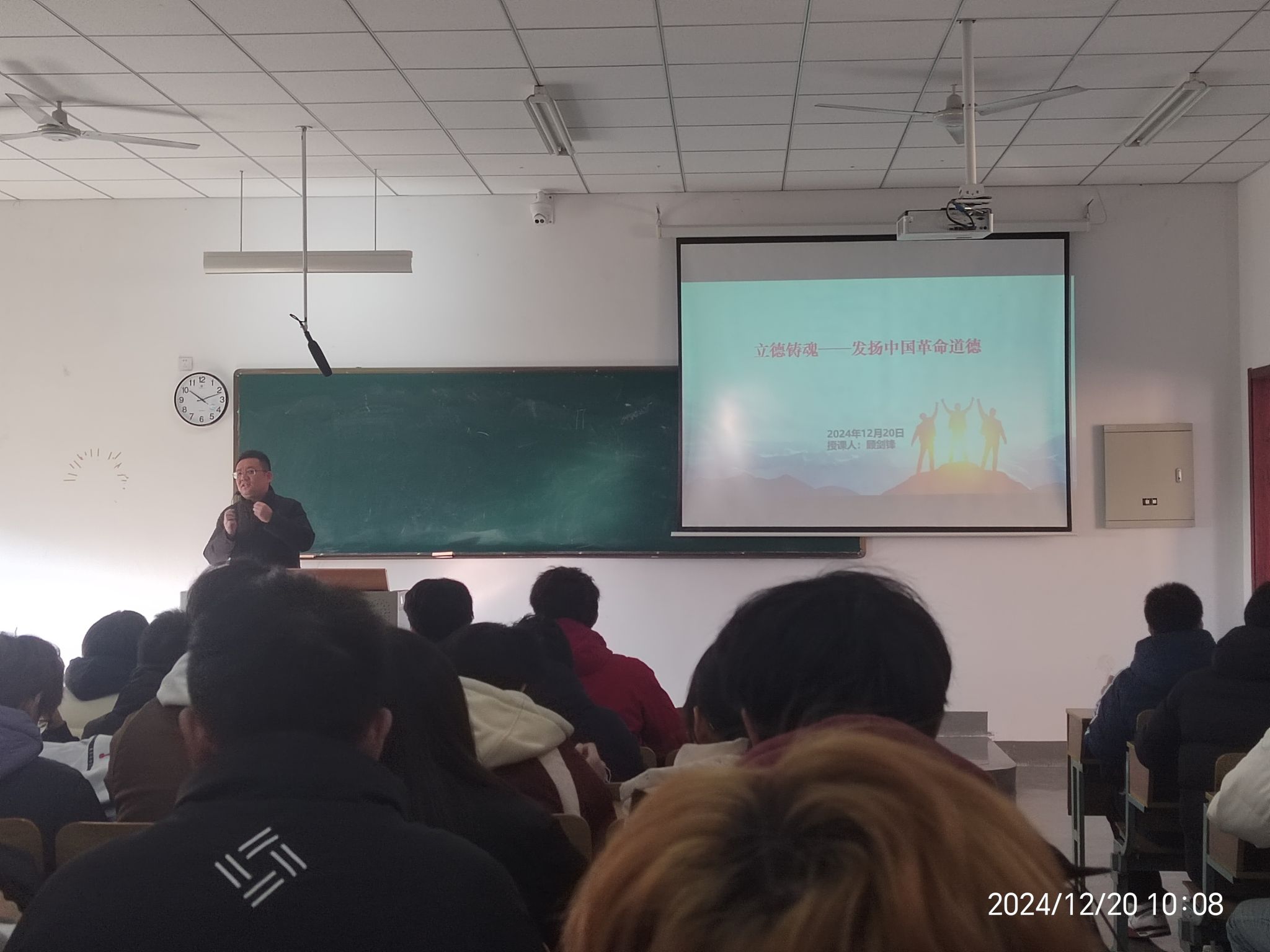 12月20号,校纪委书记(监察专员)顾剑锋在海门校区东教B304教室为建筑工程学院24道桥工程123班同学们讲授了《思想道德与法治》第五章“发扬中国革命道德”专题。他运用宏观视野、生动案例与详实数据,全面解读了中国革命道德的主要内容,深刻剖析了学习中国革命道德的当代价值,勉励同学们继承和发扬中国革命道德,以实际行动践行革命道德,赓续红色血脉,把革命先烈流血牺牲打下的红色江山守护好、建设好,为推动社会主义道德建设作出自己的贡献。(宣传部)