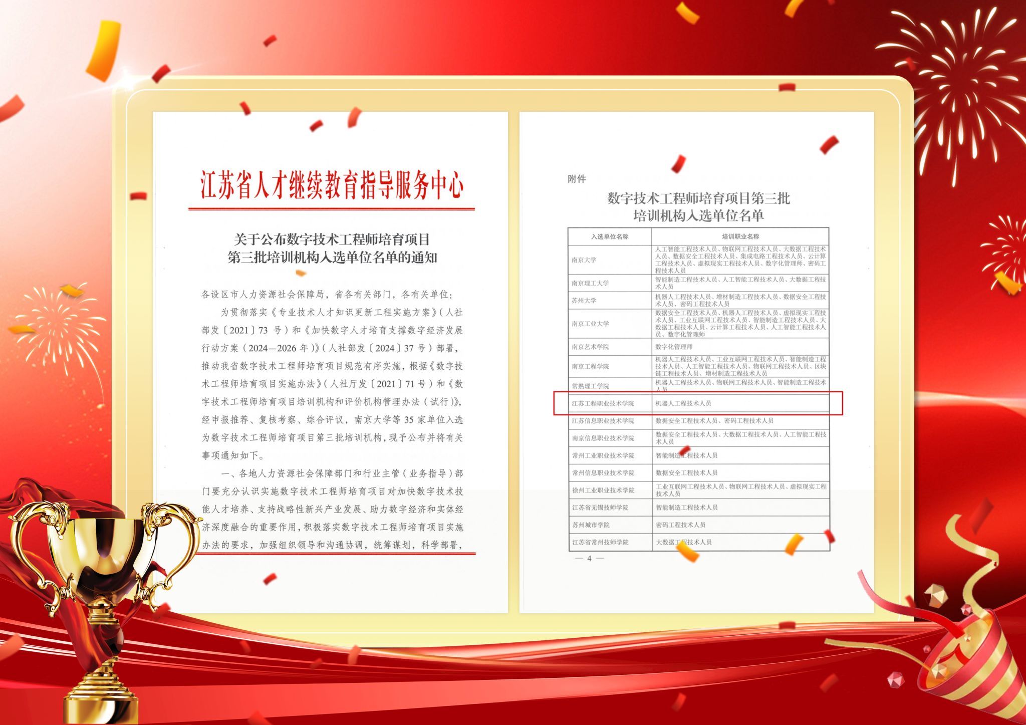 近日,江苏省人才继续教育指导服务中心公布了我省数字技术工程师培育项目第三批培训机构入选单位名单,我校“机器人工程技术人员”项目成功获批。