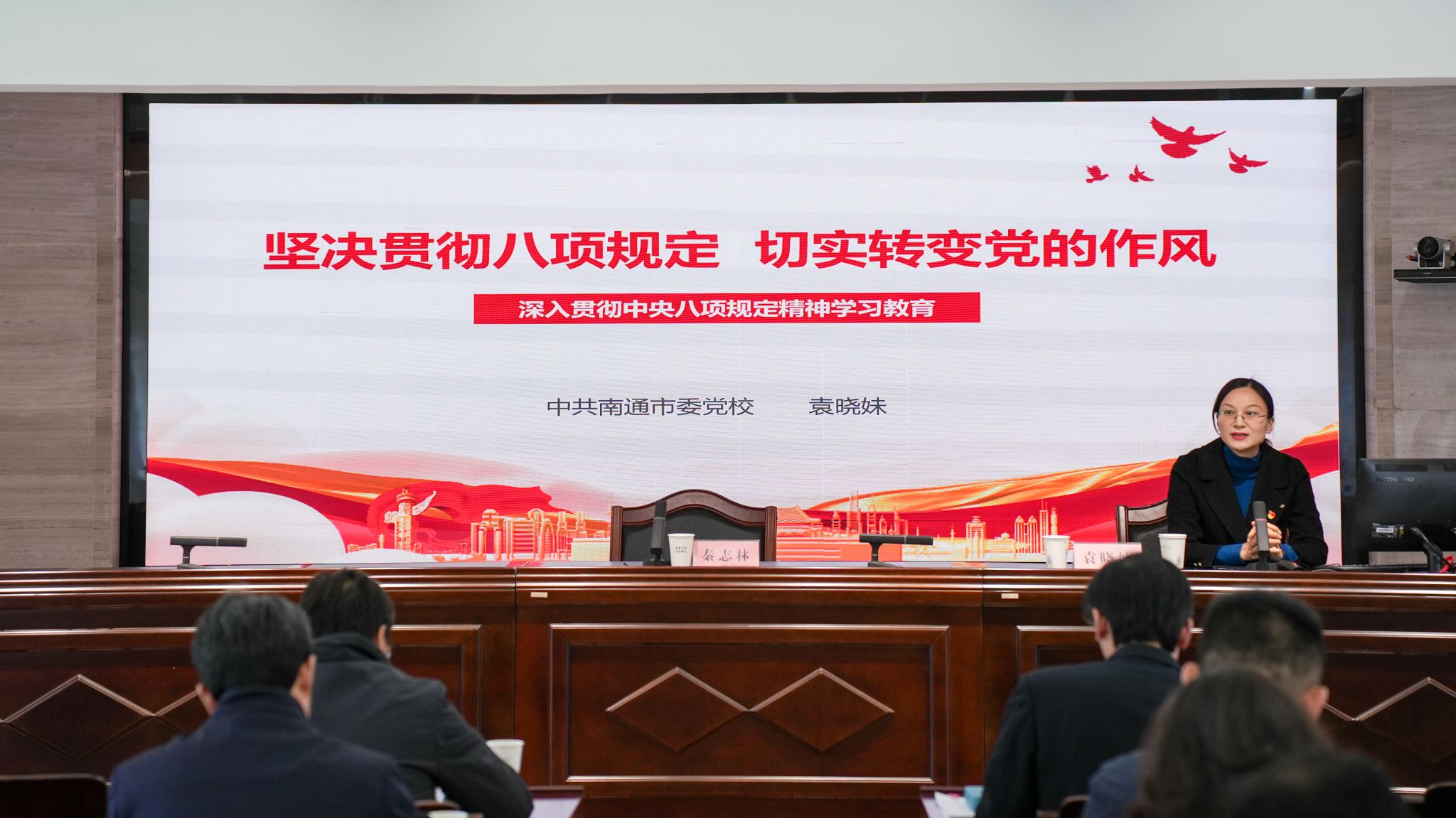 会上,南通市委党校基本理论与党史党建教研室主任袁晓妹教授应邀为学校党员干部作《坚决贯彻八项规定 切实转变党的作风 深入贯彻中央八项规定精神学习教育》专题辅导报告。袁晓妹以中央八项规定及其实施细则的重要意义为切入点,深入解读了中央八项规定及其实施细则的具体要求,详细阐释了如何高质量开展深入贯彻中央八项规定精神学习教育的方法和路径。报告主题鲜明、脉络清晰、内容丰富、阐释精准,既有政策理论高度,又紧密联系工作实际,具有很强的针对性和指导性,为全校党员干部深刻把握中央八项规定精神的时代内涵、核心要义和实践要求提供了指导。