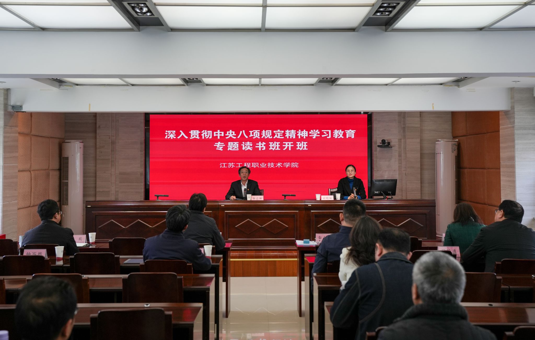3月31日下午,我校在行政楼第四会议室召开深入贯彻中央八项规定精神学习教育专题读书班暨党委理论学习中心组(扩大)学习会。校党委书记秦志林主持学习会并讲话,校党委理论学习中心组全体成员、全体中层干部聆听报告。
