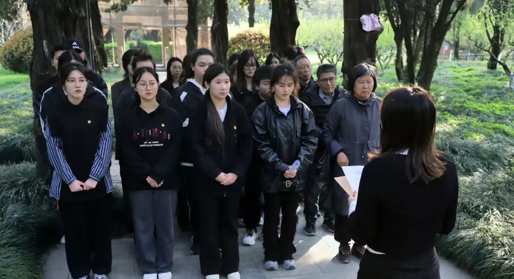 在庄严肃穆的张謇墓前,师生们整齐列队,怀着崇敬的心情举行祭扫仪式。全体人员肃立默哀,向张謇先生墓敬献亲手制作的纸花,表达深切缅怀之情。团员代表骆子晴深情诵读了纪念张謇精神的诗歌,道出了对先贤的无限敬仰。