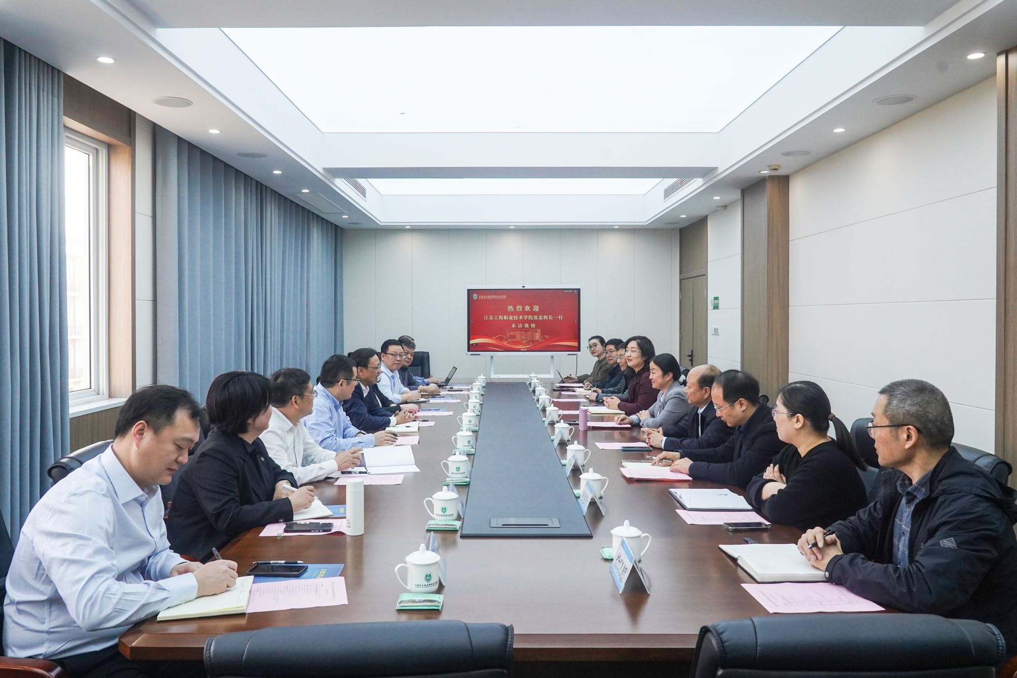 考察组一行在江苏食品药品职业技术学院受到该校党委副书记、校长翟玮玮的热情接待。调研会上,翟玮玮对学校发展历程、发展理念、办学规模、专业设置、办学特色、管理经验等方面进行了详细介绍。双方与会人员聚焦产教共同体建设、二级资源配置与考核、“大思政”格局建设、财务管理与预算绩效、高层次人才引进与培养、标志性成果培育、国际化办学机制等工作进行了深度交流。