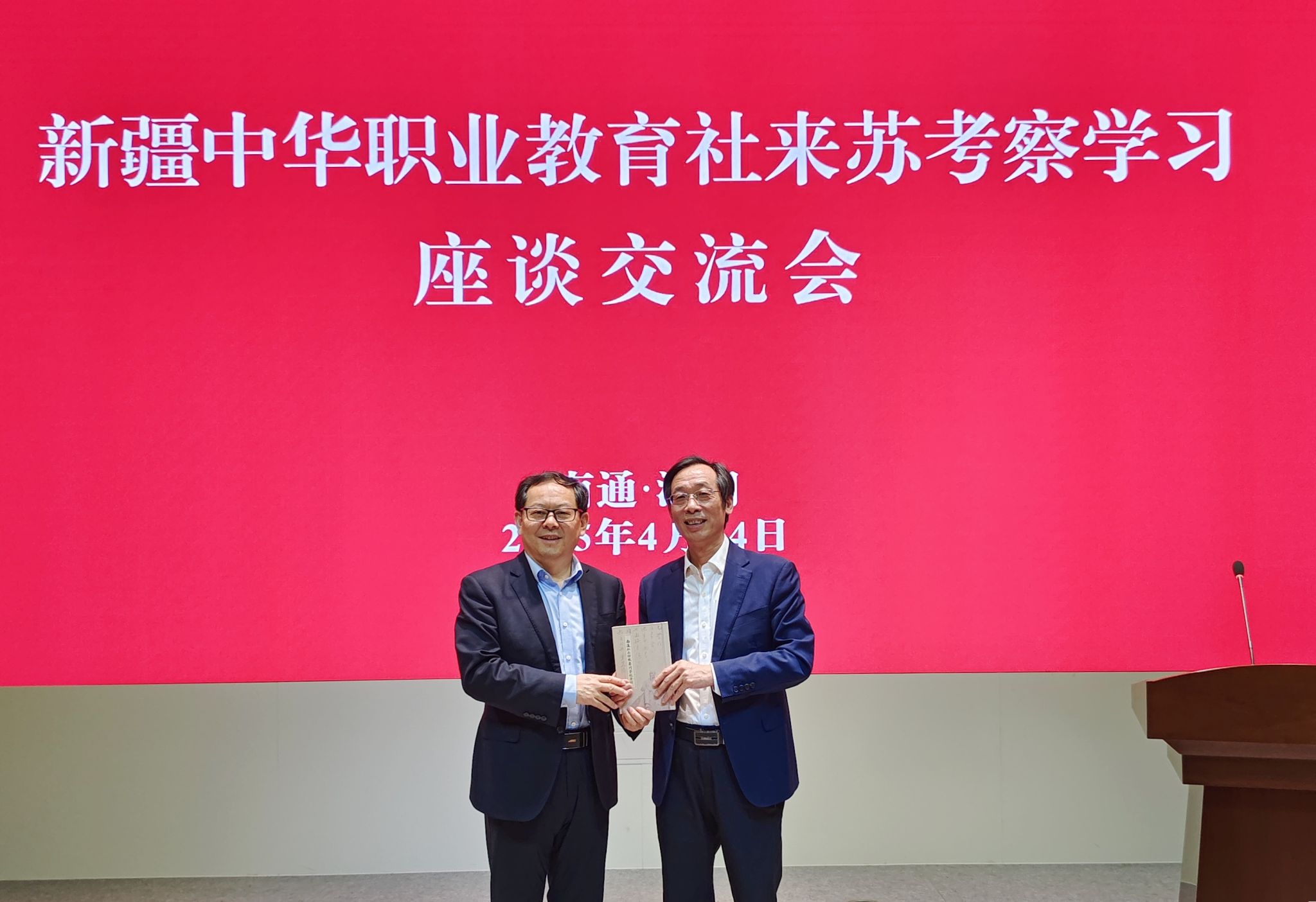 4月24日,新疆中华职业教育社主任、民建新疆区委会主委、自治区人民政府国家305项目办公室主任马华东率新疆中华职业教育社一行10余人来南通考察交流职教社工作。江苏省委统战部一级调研员、省中华职教社秘书长胡恒锁,省中华职教社秘书处主任袁旭,南通市政协副主席、民建市委会主委、市中华职教社主任张一峰,南通市委统战部副部长、市中华职教社副主任王文圣出席座谈交流会。会上,我校党委书记秦志林以《擎职教社旗帜 聚新发展合力——协同构建职业教育高质量发展新格局》为题作专题讲座。