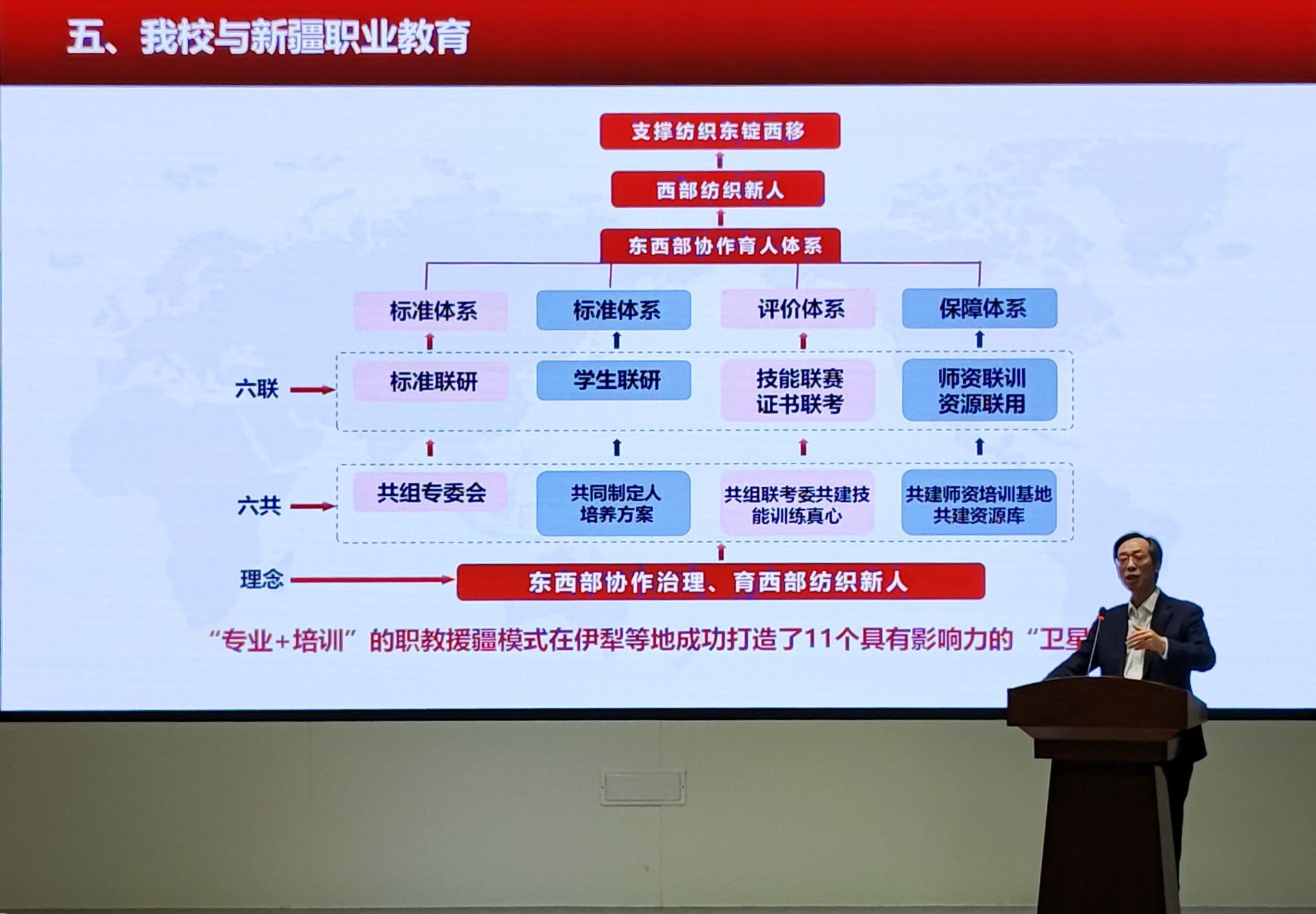 秦志林系统梳理了中华职业教育社1917年由黄炎培、张謇等先贤创立的百年历程,强调其“使无业者有业,使有业者乐业”的宗旨与红色基因始终与国家发展同频共振。他以张謇“学必期于用,用必适于地”的理念为例,剖析职业教育扎根地方、服务实业的实践价值,并指出长三角地区通过跨省中高职贯通培养、产教资源共建共享等举措,推动20所高职院校入选国家“双高计划”,形成产业与教育“双向奔赴”的协同格局。他重点介绍了江苏工程职业技术学院的援疆成果:2024年指导克州职院获“一带一路”技能大赛一等奖,通过“慕课西行”共建课程、实施“六共六联”机制,在伊犁等地建成11个“卫星校”,其“东西部协作育人体系”获2022年国家级教学成果二等奖。讲座以史为鉴、立足当下、展望未来,既彰显了中华职教社百年精神传承,又为长三角一体化、江苏职教创新及东西协作提供了实践路径。