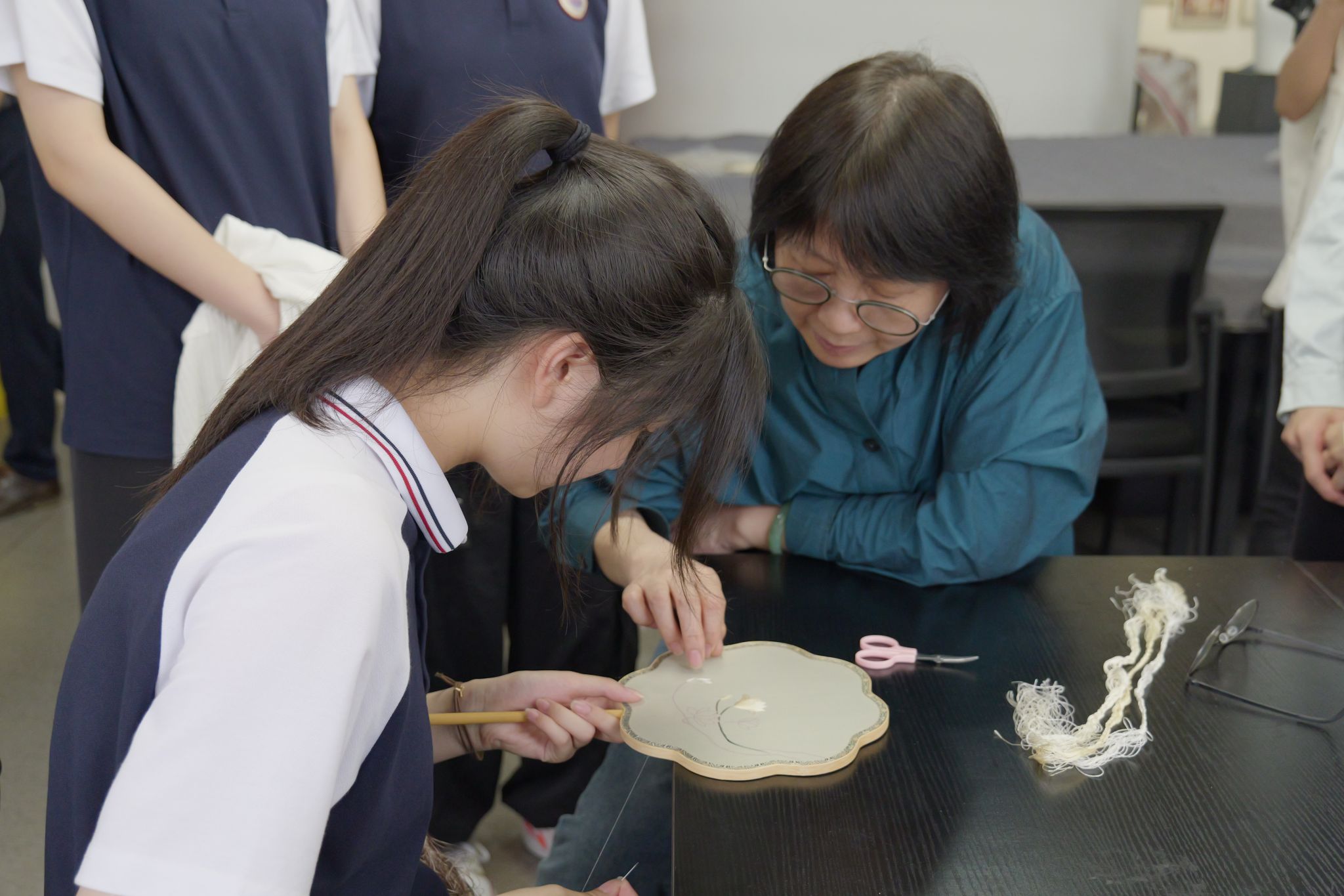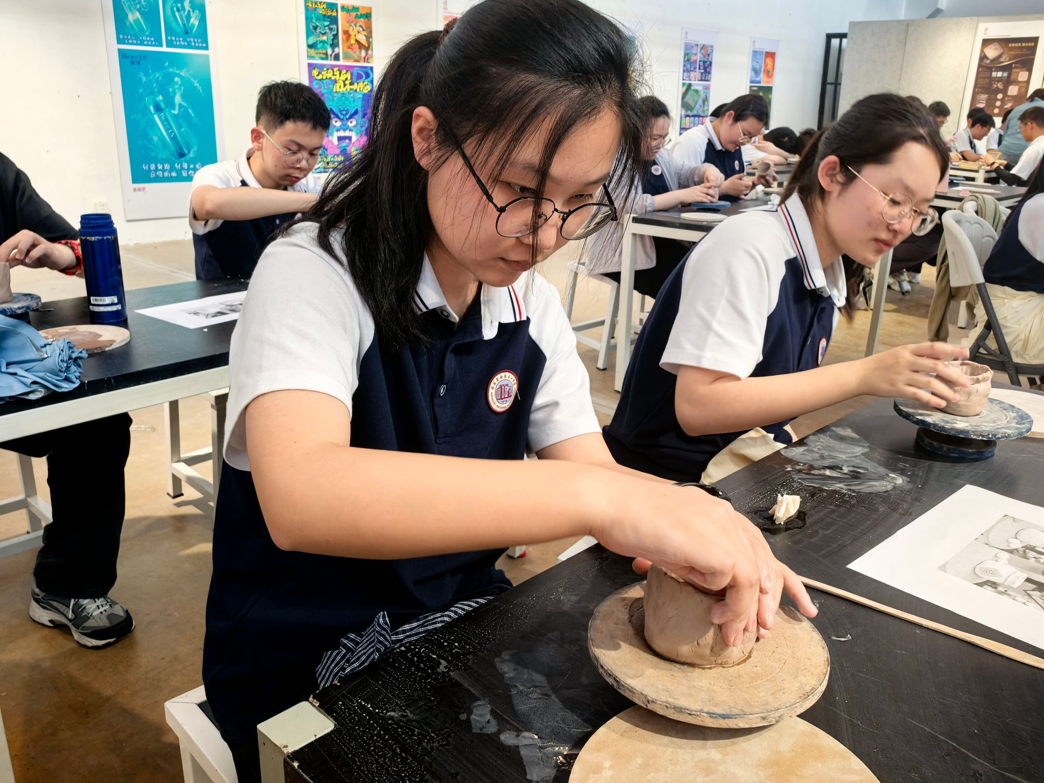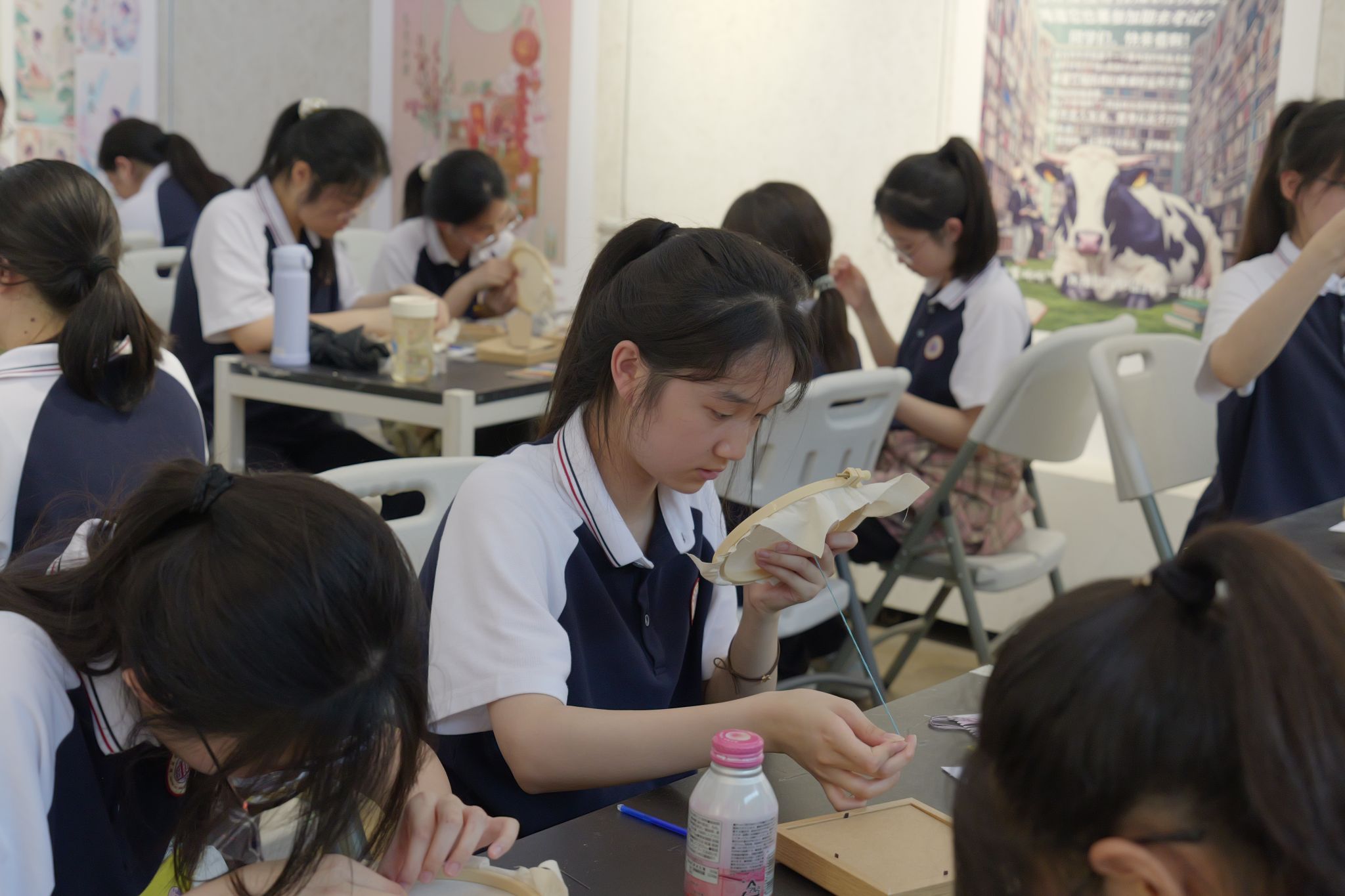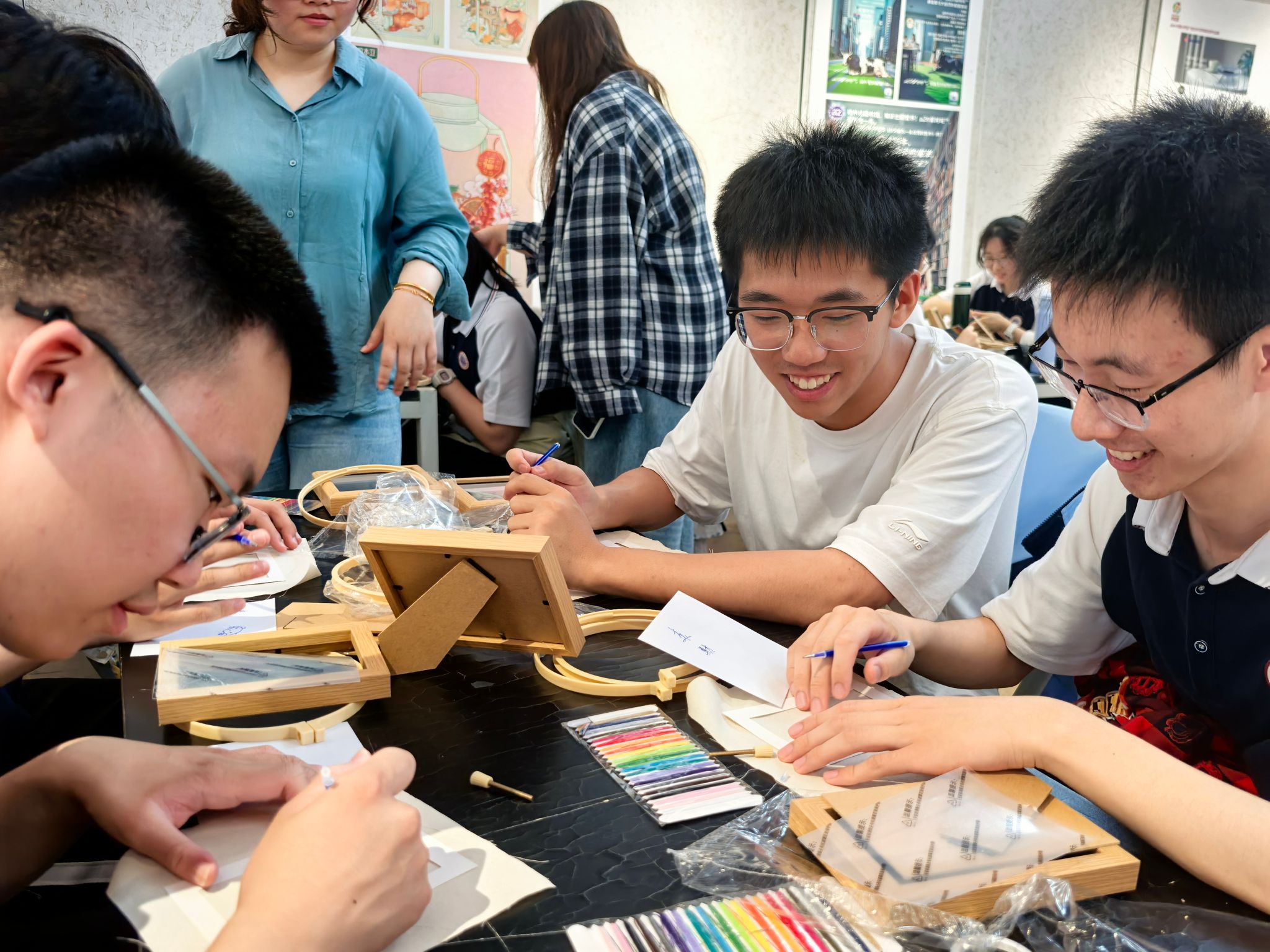 活动现场设置“非遗工坊”各个教学实践区,将传统文化与劳动教育、职业认知启蒙、工匠精神培育深度融合。在扎染体验区,学生通过捆扎、浸染等非遗传统工艺,在蓝白相间的纹样变幻中领悟“天然去雕饰”的生态智慧与设计美学;在书签制作区,老师指导学生运用激光雕刻与手工装帧技术,将校训格言与南通建筑剪影巧妙融合,在方寸之间体验“文创产品从设计到量产”的完整产业链;在陶艺工作台前,陶艺专业教师用泥巴示范完成拉坯成型、图案绘制等工序,学生通过“泥土重塑到艺术呈现”的全流程实践,诠释“匠心造物”的职业内涵;在刺绣体验区,国家级非物质文化遗产苏绣(南通仿真绣)省级代表性传承人、艺术设计学院张蕾老师详细讲解了沈绣的发展历史和技艺传承,带领同学们亲身体验仿真绣“细、匀、光、齐”的针法技巧,感受刺绣针法与绣线灵活运用的工艺美感。