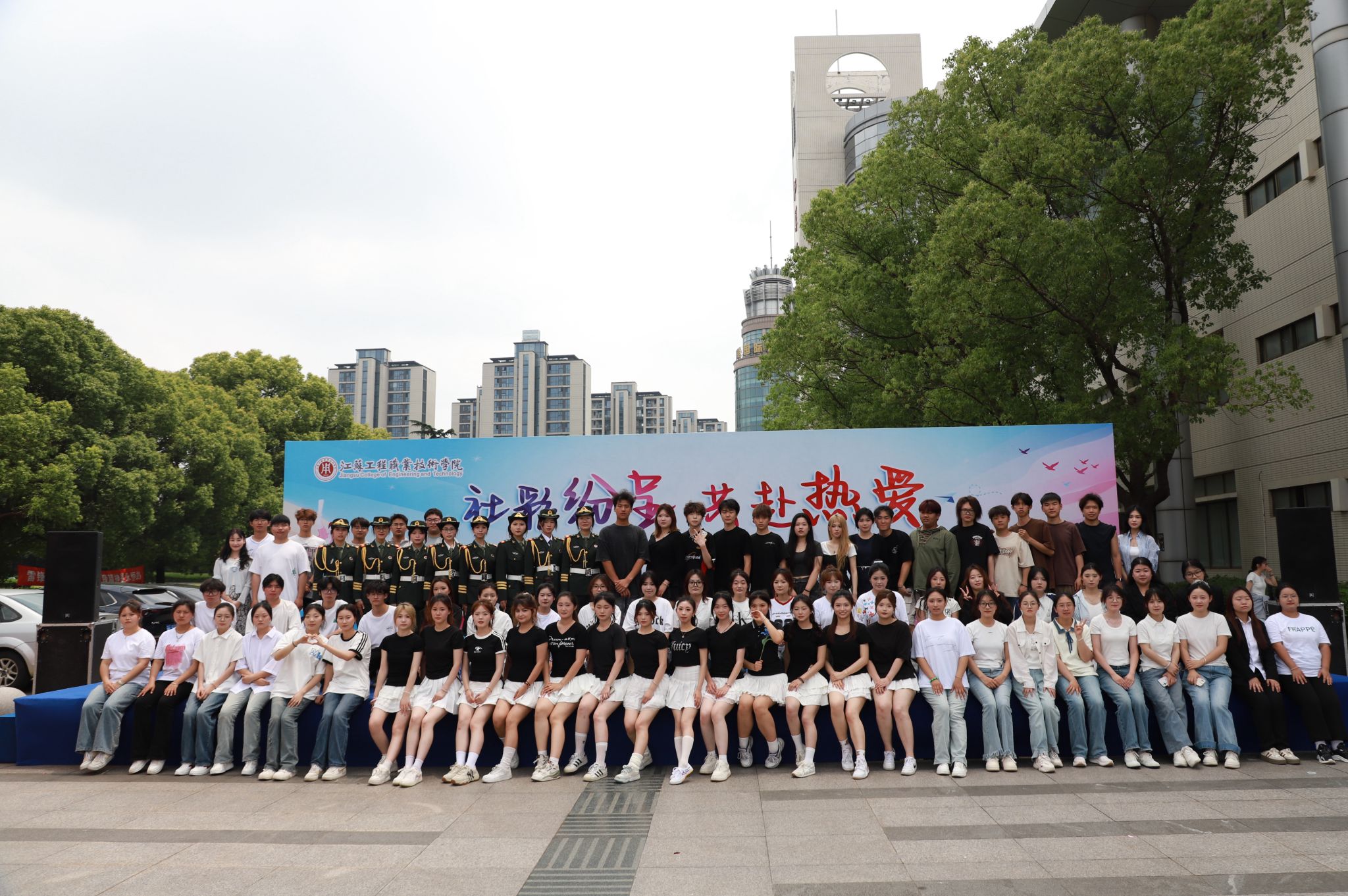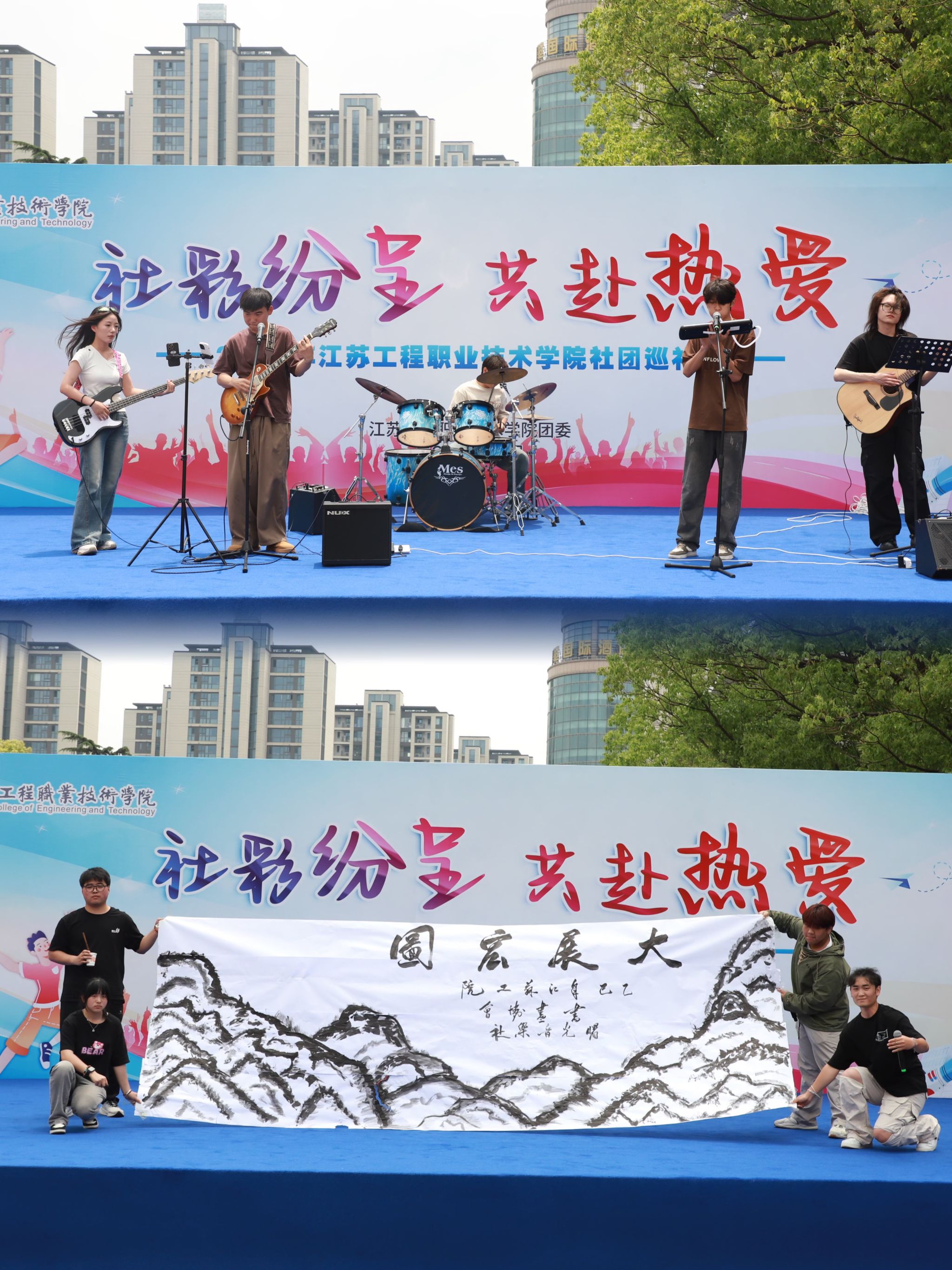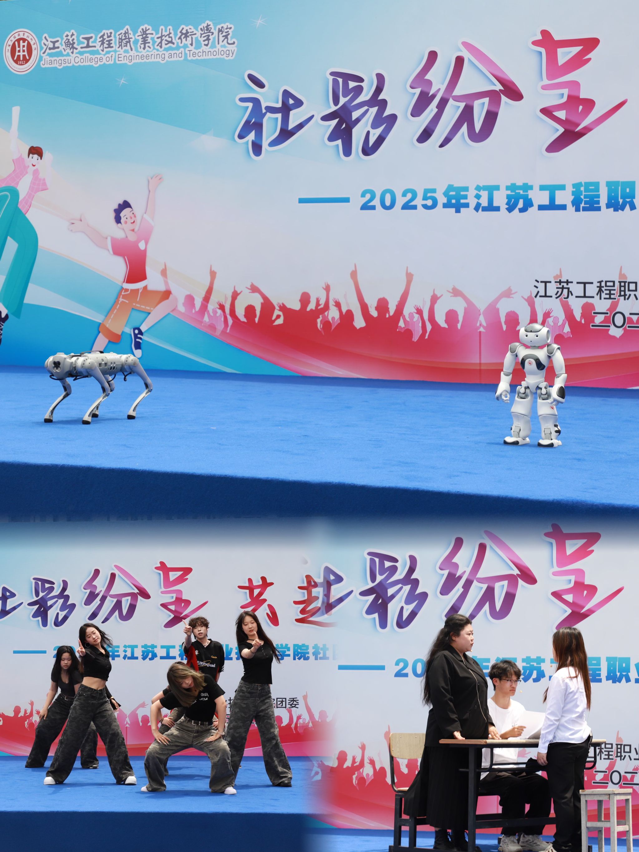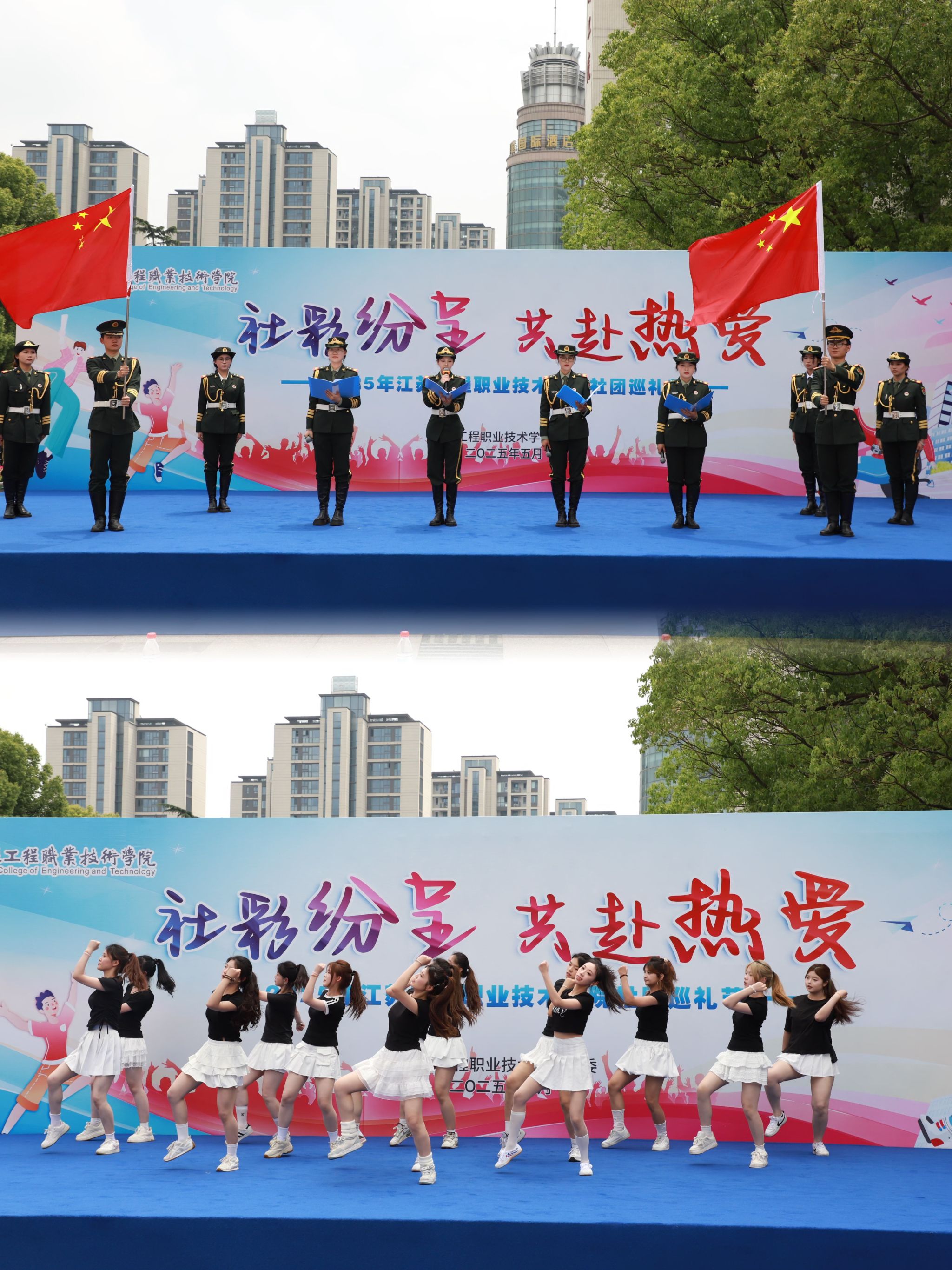 5月22日中午,江苏工院“‘社’彩纷呈、共赴热爱”社团巡礼节开幕式在崇川校区强毅楼北广场火热启幕。校党委副书记丛彬彬、学工部部长徐明、团委副书记沈雯、二级学院团总支书记、社团指导教师代表以及数百名学生齐聚一堂,共同见证这场融合舞台艺术与文化市集的青春盛会。活动以“台上展演+台下市集”双轨互动形式展开,既呈现了动态的视听盛宴,又搭建了静态的成果展示平台,全方位展现学生社团的创新活力与文化底蕴。