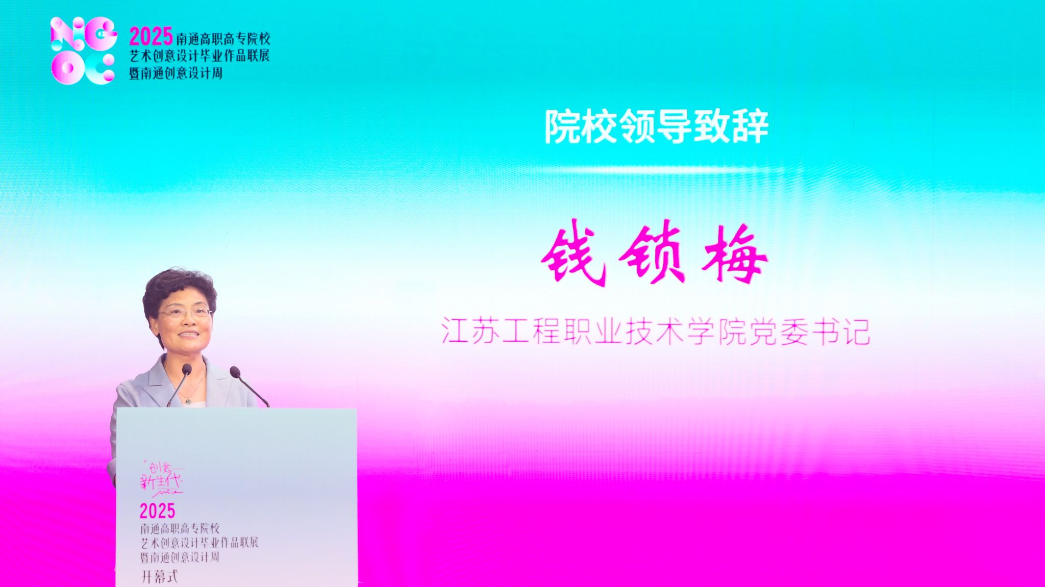 钱锁梅在开幕式上致辞。她指出,这场由我校牵头发起的创意盛会,如今已成为南通高职院校毕业季最具活力的文化景观,在传统文化的现代表达、艺术与科技的融合创新、产学研用的深度融合等领域开辟了更多的实践途径。她表示,未来将与兄弟院校携手,进一步探索设计服务地方经济的创新举措,为南通文化创意产业升级注入强大动力,为南通经济社会发展作出更多贡献。