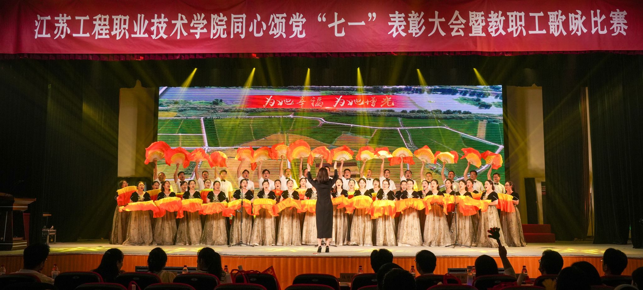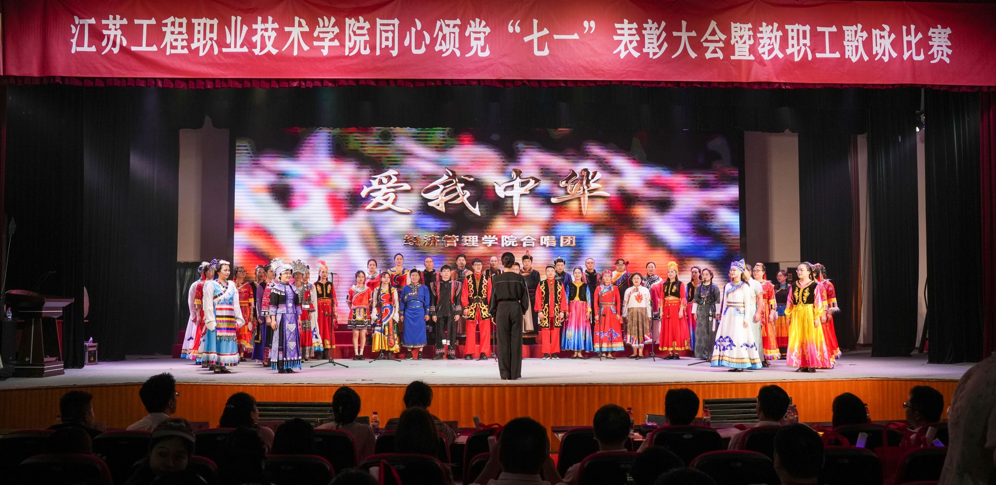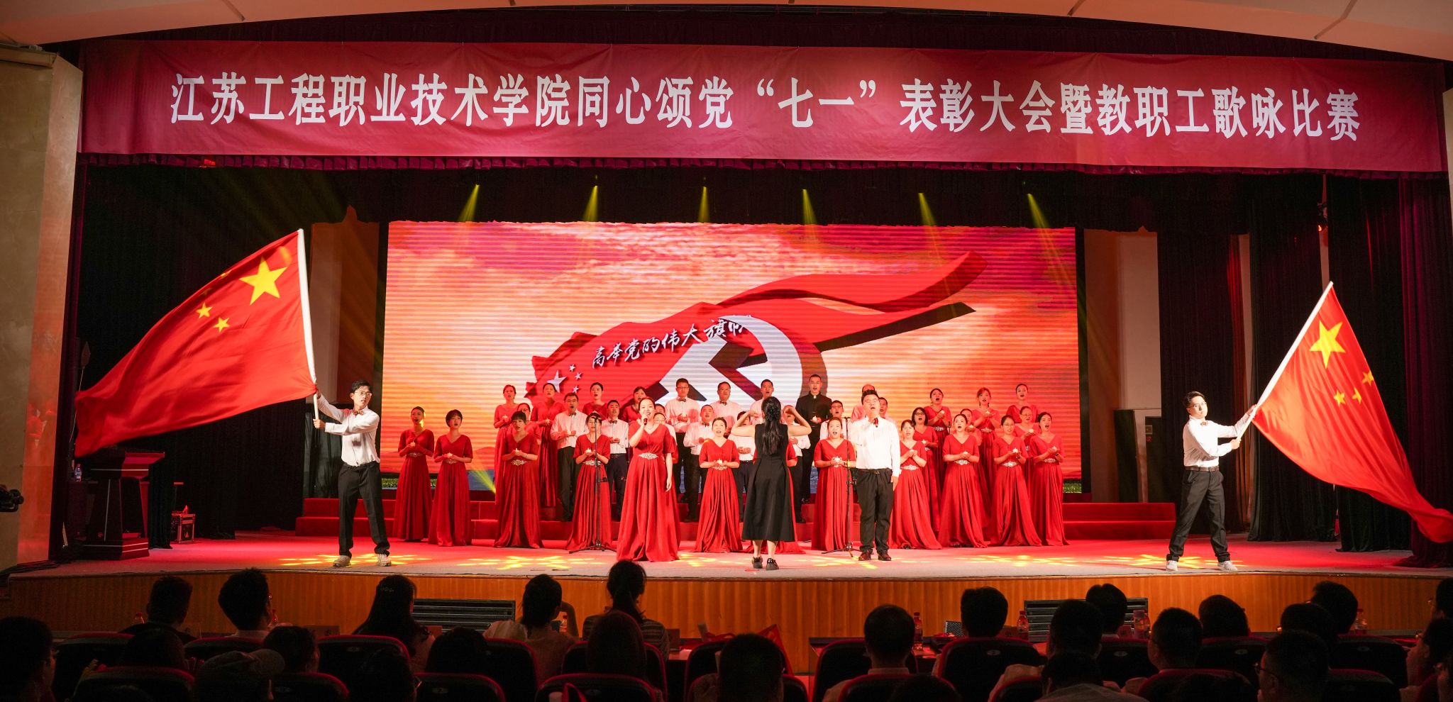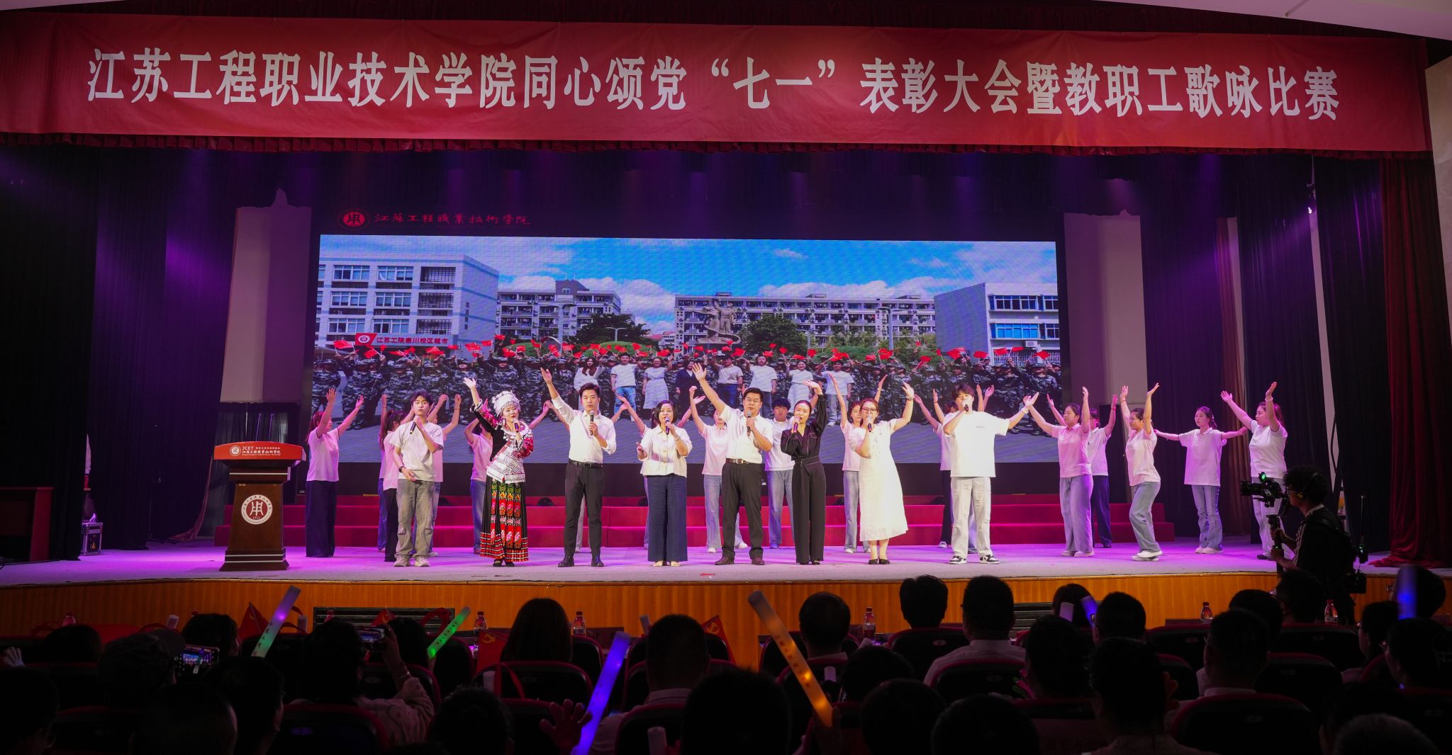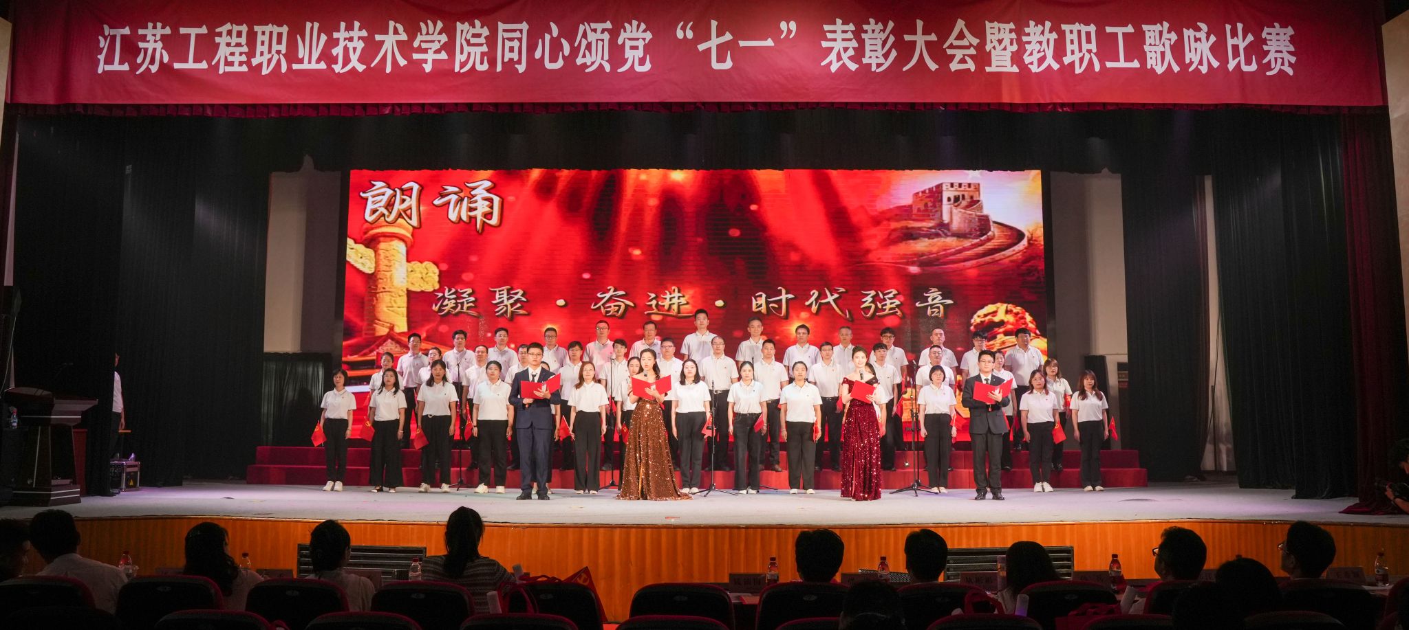 表彰结束后,教职工歌咏比赛正式启幕。来自各二级党总支的10支合唱队伍依次献唱《天耀中华》《爱我中华》《映山红》《我和我的祖国》《在希望的田野上》《团结就是力量》《红旗飘飘》《中国、中国,鲜红的太阳永不落》《领航》《英雄赞歌》等经典歌曲。各队着装统一,情绪饱满,展现了积极向上的精神风貌。青年教师代表深情朗诵《我骄傲,我是江苏工院人》《民族的丰碑》,将现场气氛再推高潮。