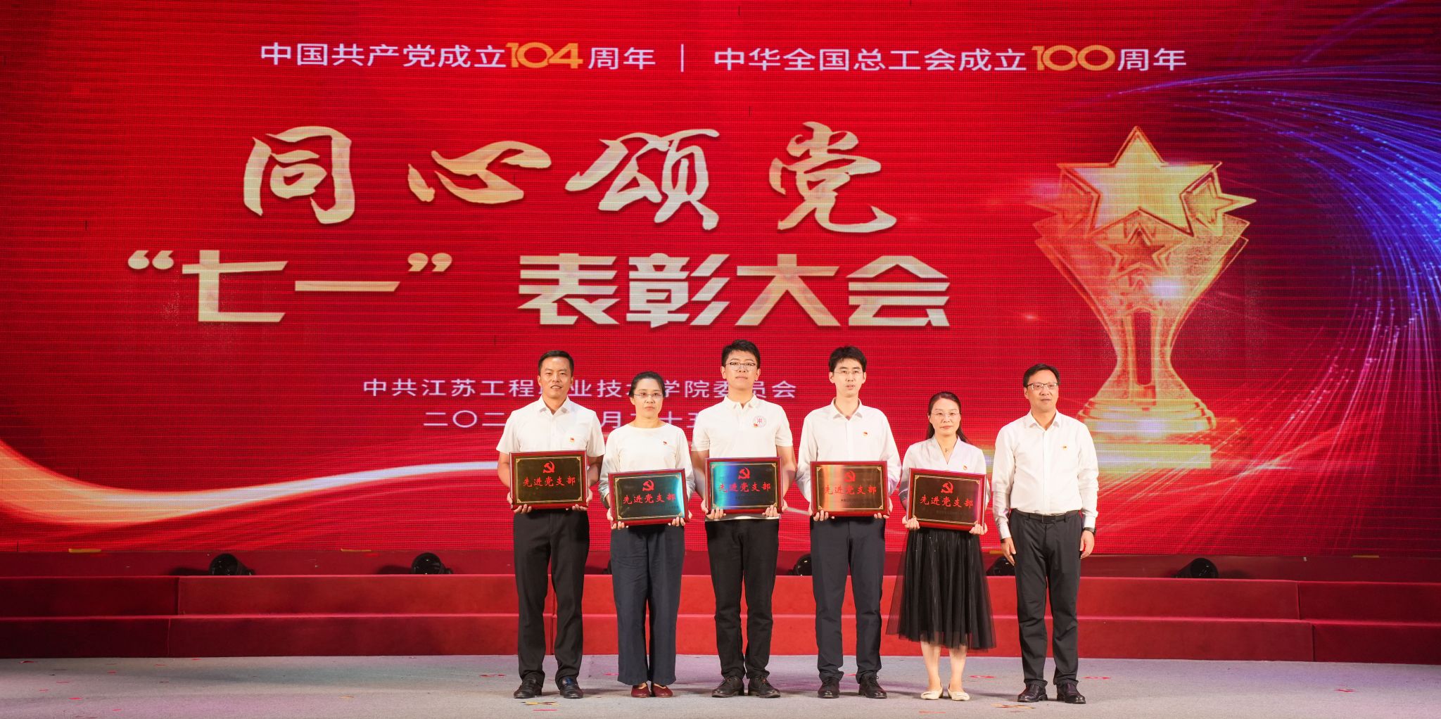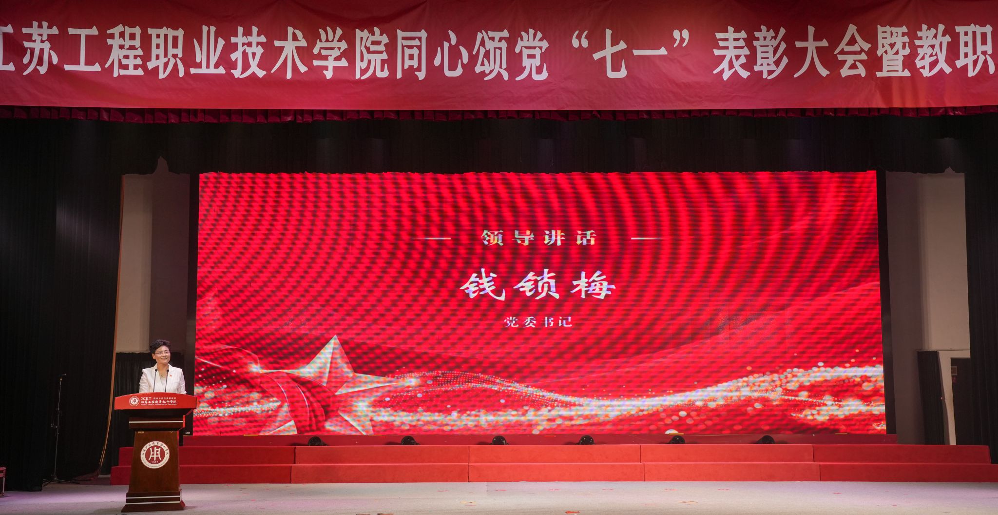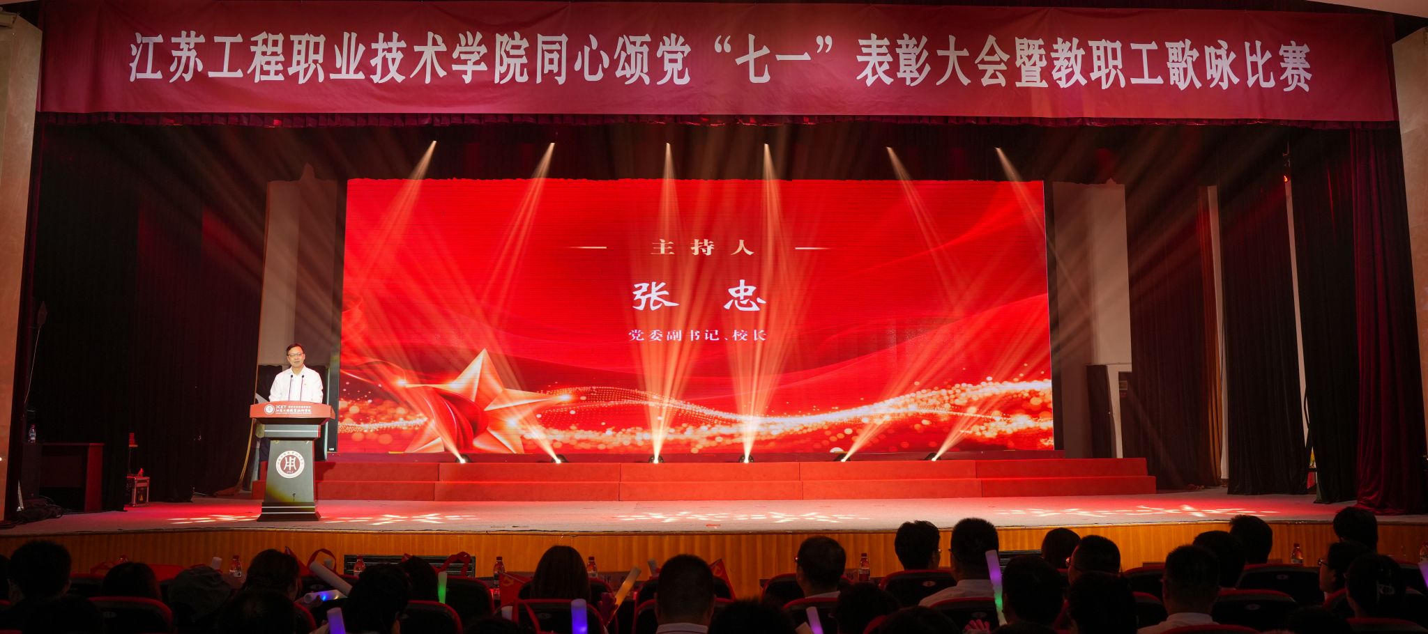 为庆祝中国共产党成立104周年、中华全国总工会成立100周年,6月25日下午,我校在崇川校区大礼堂隆重举行同心颂党“七一”表彰大会暨教职工歌咏比赛。校党委书记钱锁梅出席活动并讲话。全体校领导、相关党政职能部门负责人、各二级学院党政领导、师生代表等千余人参加活动。校党委副书记、校长张忠主持表彰大会。
