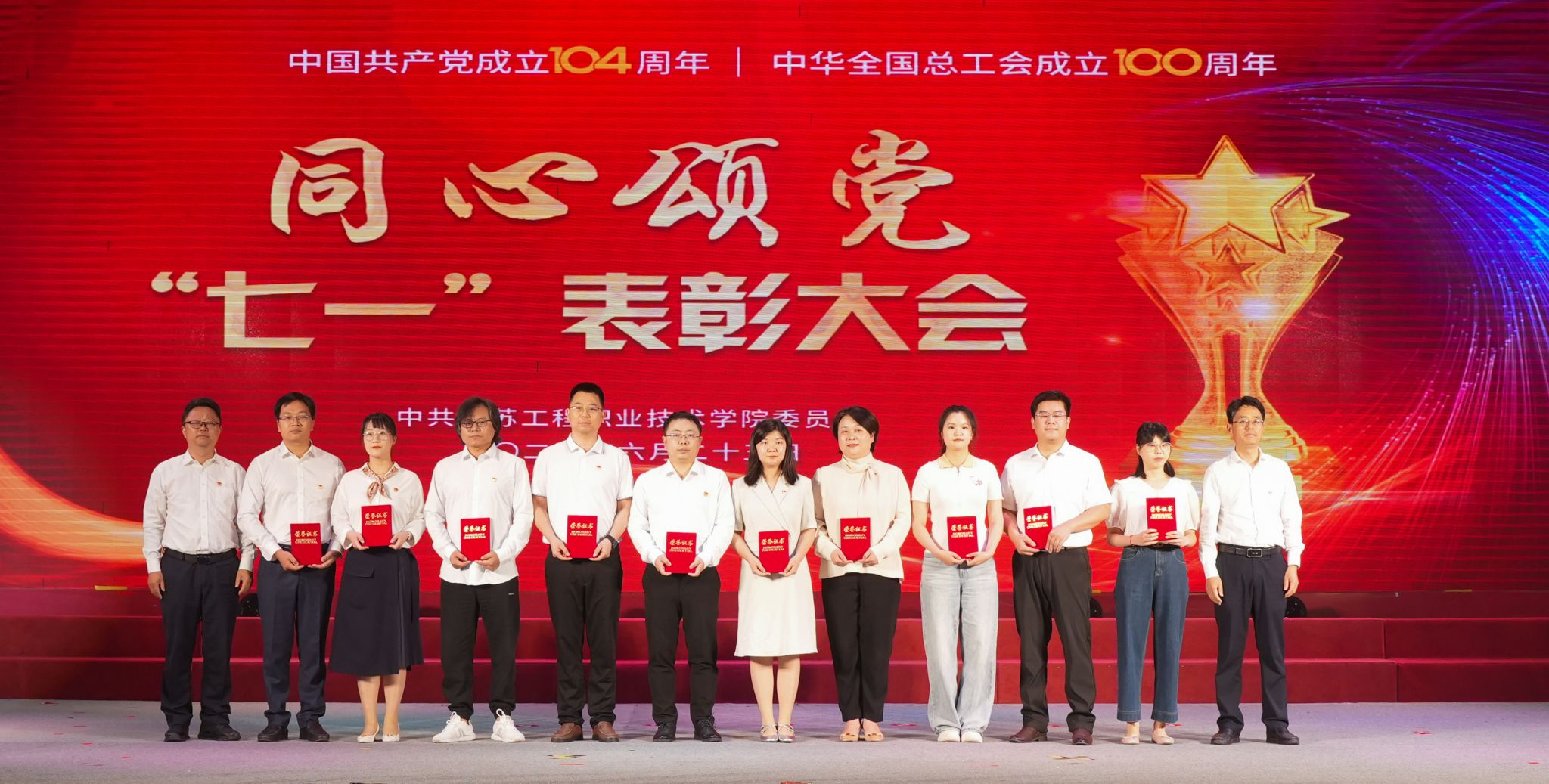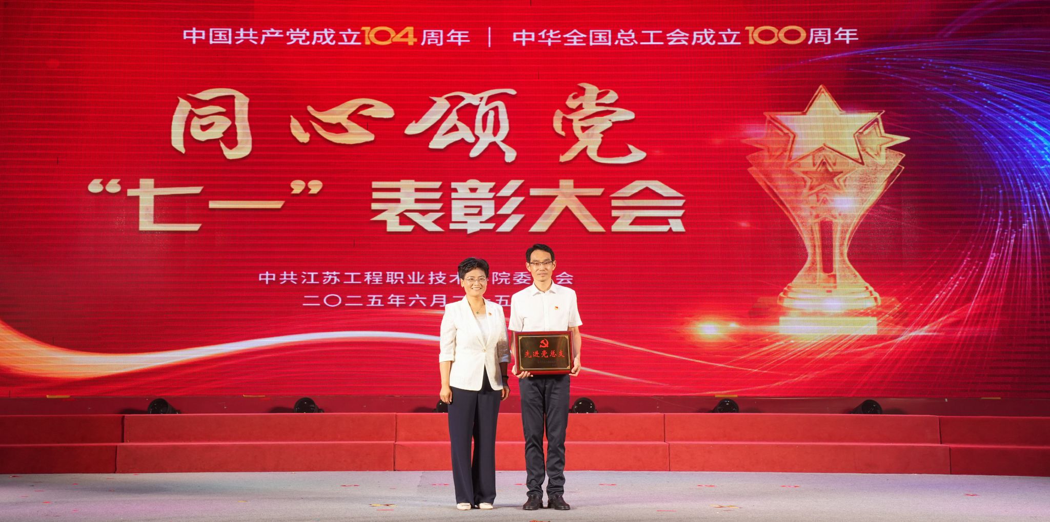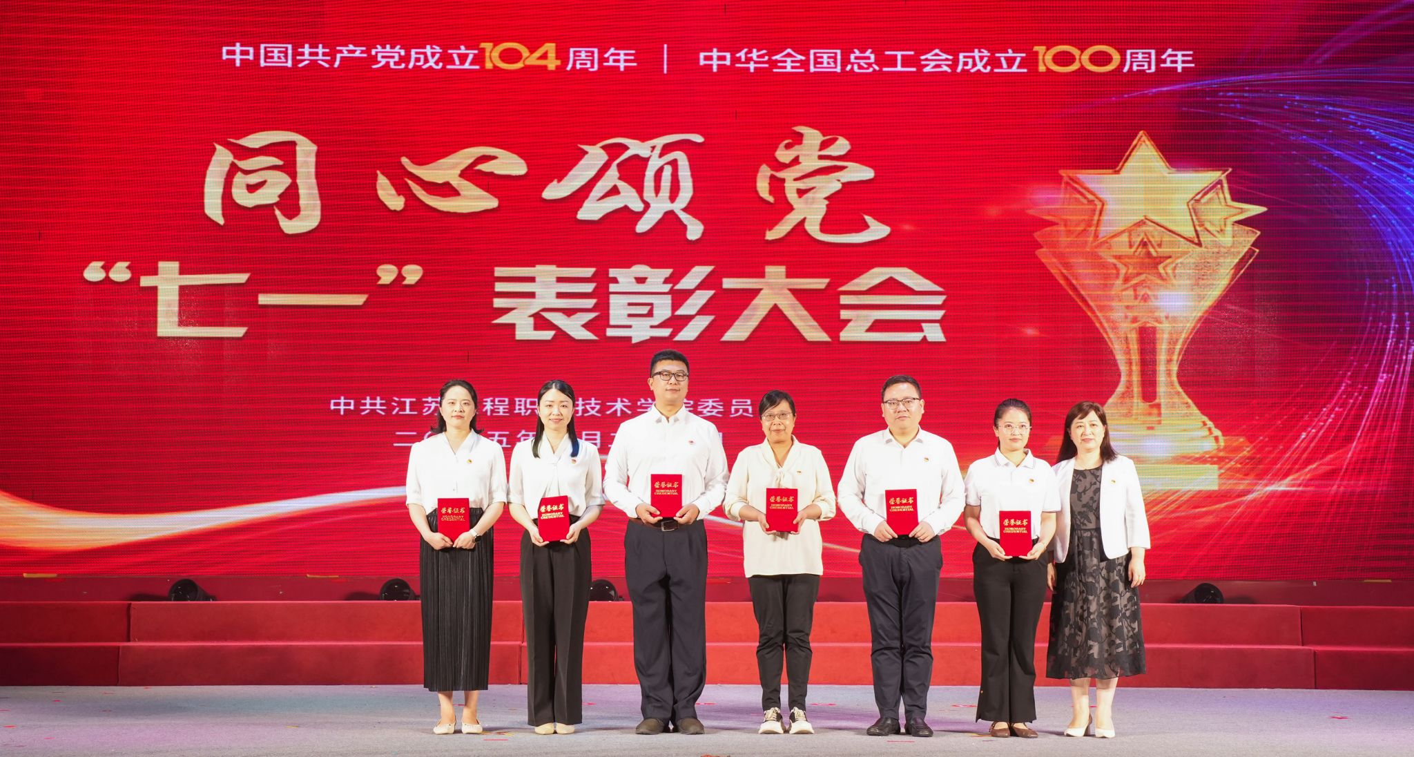 为庆祝中国共产党成立104周年、中华全国总工会成立100周年,6月25日下午,我校在崇川校区大礼堂隆重举行同心颂党“七一”表彰大会暨教职工歌咏比赛。校党委书记钱锁梅出席活动并讲话。全体校领导、相关党政职能部门负责人、各二级学院党政领导、师生代表等千余人参加活动。校党委副书记、校长张忠主持表彰大会。