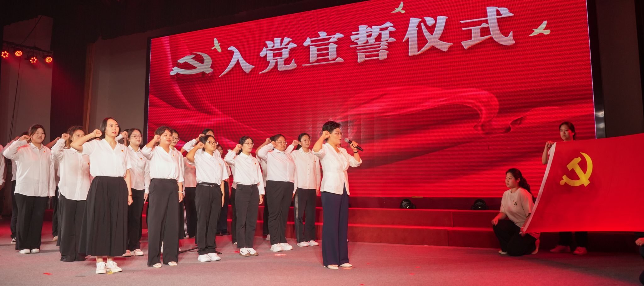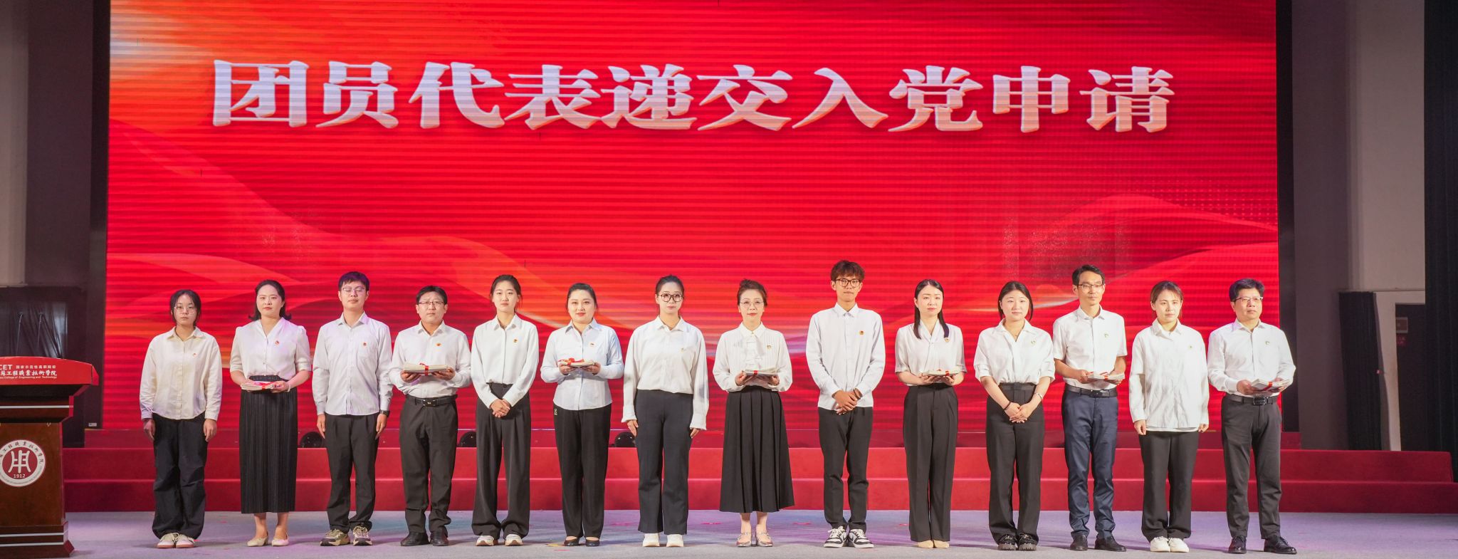 张忠宣读表彰文件。全体校领导为获得“先进党总支”“先进党支部”“优秀共产党员”“优秀党务工作者”荣誉的集体和个人颁奖。现场还举行了团员代表递交《入党申请书》和新党员入党宣誓仪式。