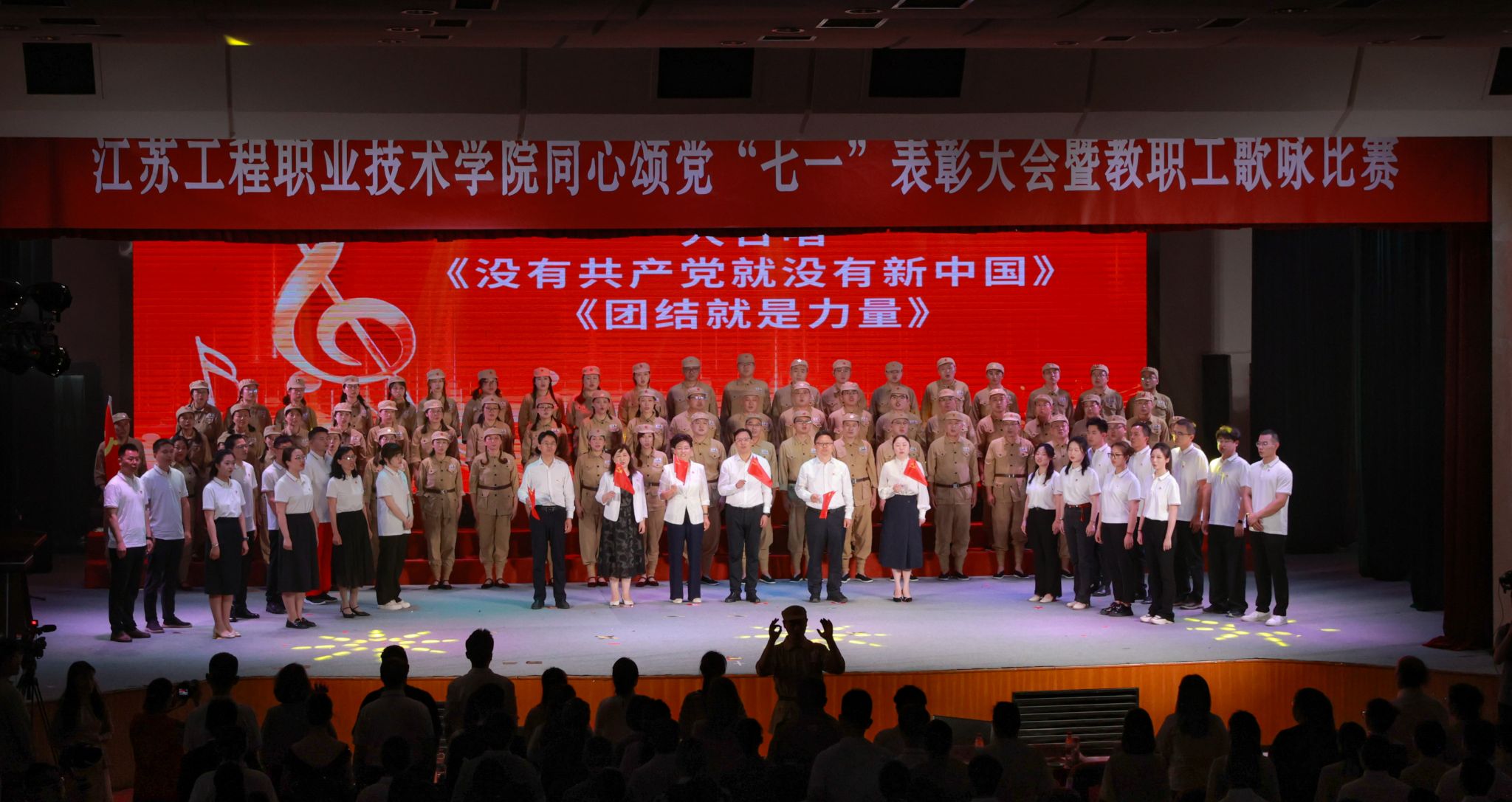 活动尾声,全体党委委员、各党总支教师代表与台下师生齐声高唱《没有共产党就没有新中国》《团结就是力量》,歌声嘹亮、掌声雷动。