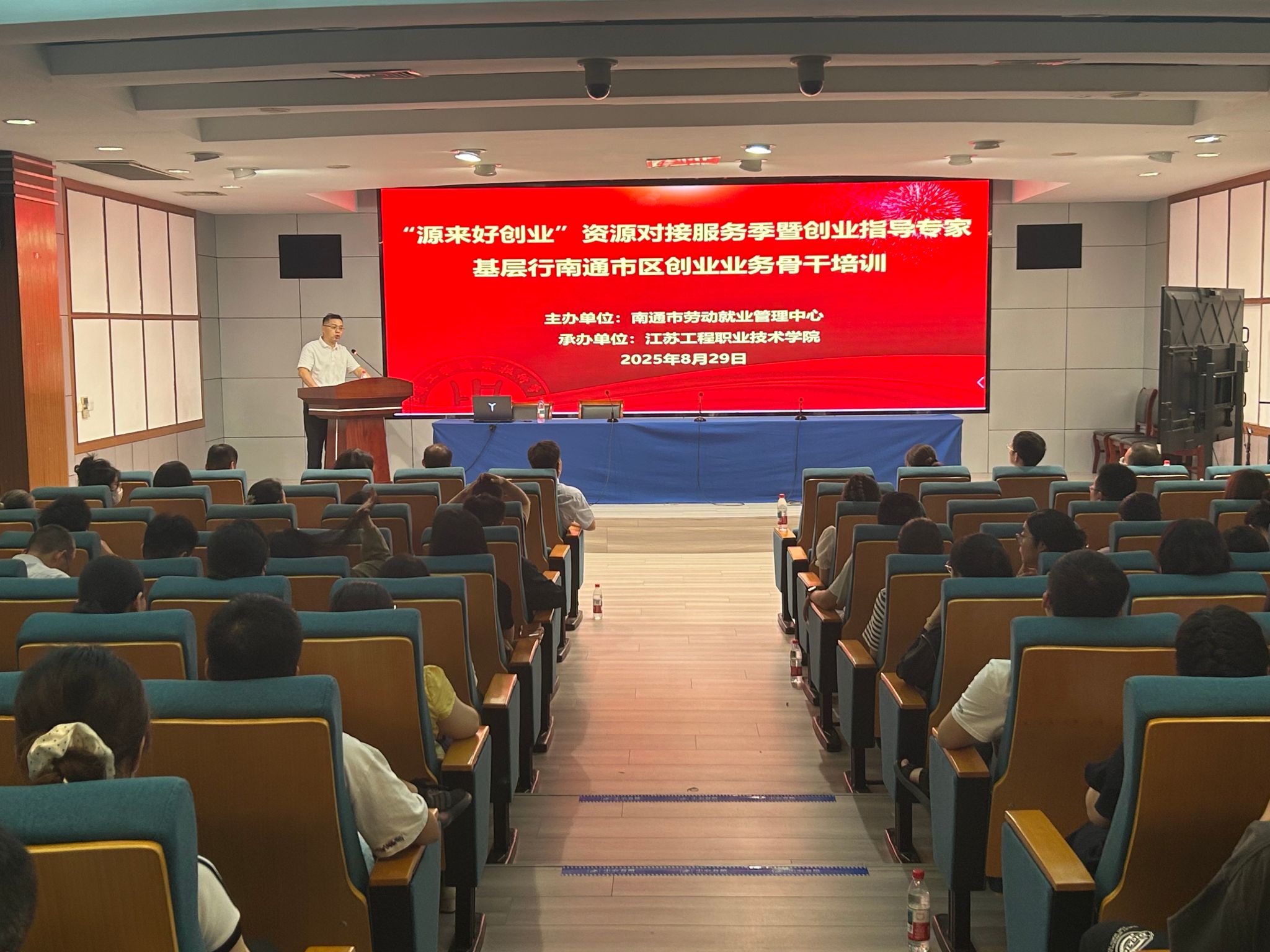 8月29日下午,我校承办的“源来好创业”资源对接服务季暨省级创业指导专家基层行南通市区创业业务骨干培训班在强毅楼 12 楼演播厅开班。南通市劳动就业管理中心副主任丁小龙、培训科科长王蓓、我校继续教育学院院长江荣华等出席开班仪式。来自崇川区、开发区分管创业工作的领导、街道创业工作业务骨干、社区业务骨干代表、市区创业孵化基地政策专员以及我校部分创业培训指导教师 70 余人参加了本次培训。