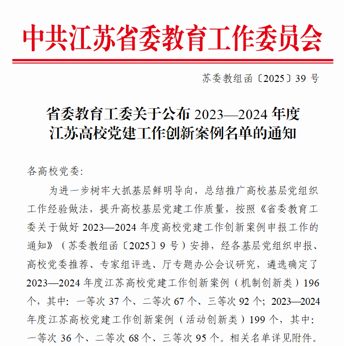 近日,省委教育工委公布了2023—2024年度江苏高校党建工作创新案例评选结果。我校推荐的纺织服装学院党总支《创新“经天纬地”党建工作法,引领纺织服装职业教育高质量发展》和航空与交通工程学院交通党支部的《“党建领航匠心传承路 接力赓续交通强国梦”主题党日活动》分别从全省近200多个案例中脱颖而出,荣获机制创新类一等次和活动创新类二等次,取得新突破。