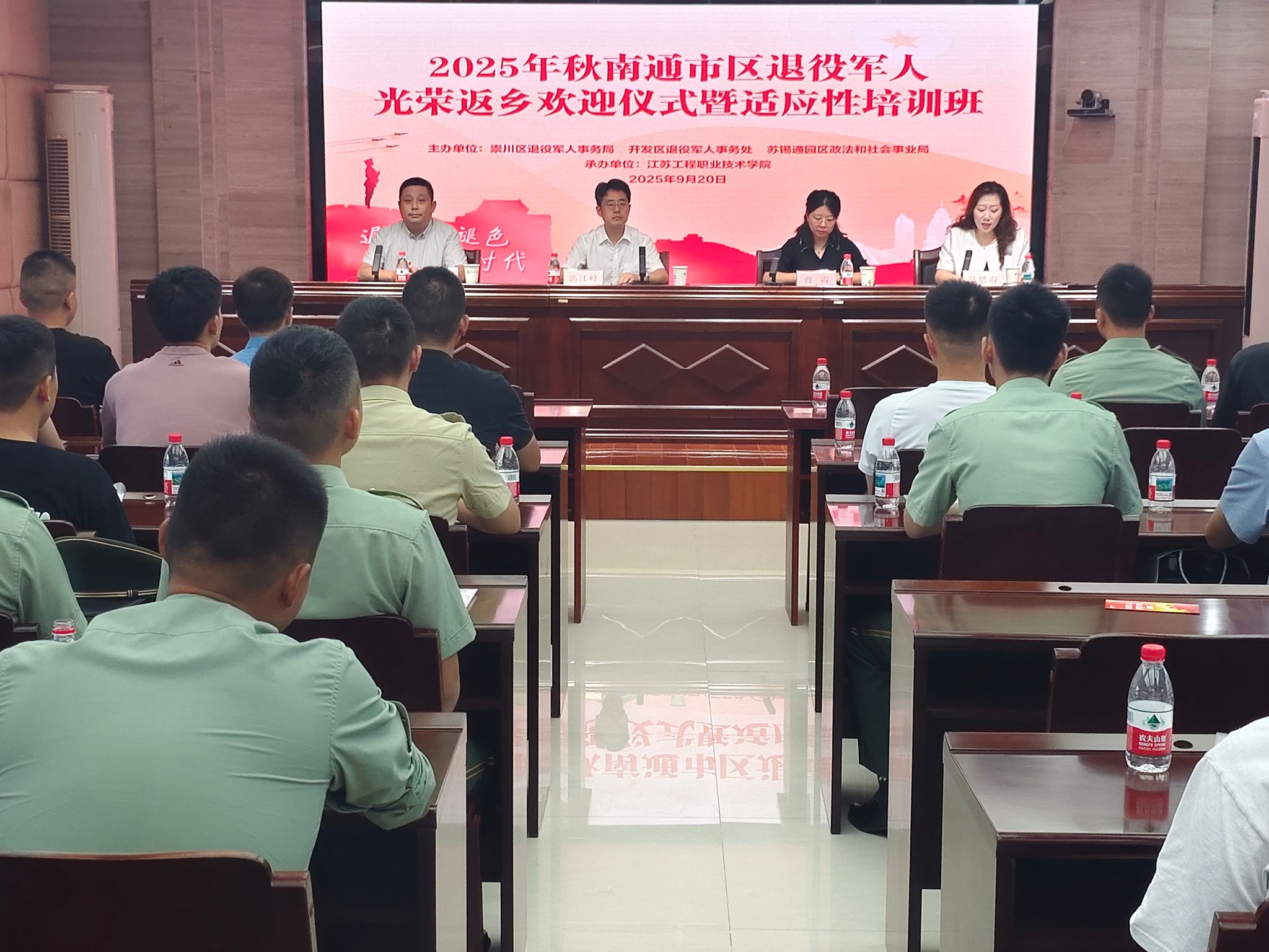 9月20日上午,2025年秋季南通市区退役军人适应性培训开班仪式在我校隆重举行。南通市崇川区退役军人事务局副局长曹霞,校党委委员、副校长郭江峰出席仪式并作开班讲话。本次培训由我校马克思主义学院承办。