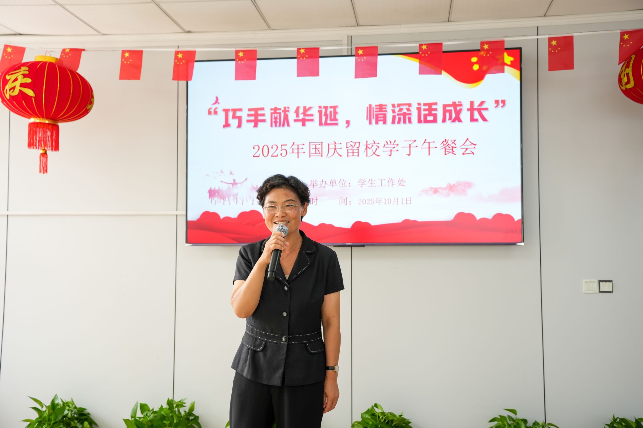 中午时分,学工处在学生食堂二楼为留校学生代表们准备了一场特别的节日午餐。钱锁梅代表学校向同学们送上节日祝福,勉励大家将爱国情怀融入个人成长,珍惜在校时光,并表示学校永远是同学们追逐梦想的坚强后盾。午餐期间,来自新疆、西藏的民族学生们即兴献上了富有民族特色的歌舞表演,欢快的节奏与优美的舞步瞬间点燃全场。